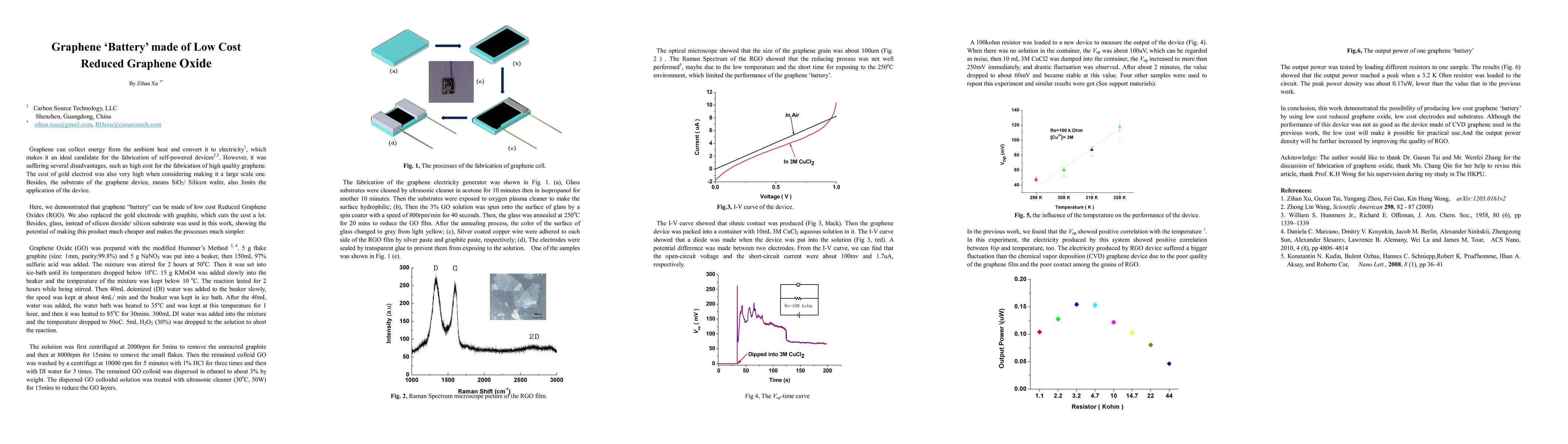 This research demonstrates a cost-effective graphene battery using low-cost reduced graphene oxide, graphite electrodes, and glass substrates, making it a feasible option for practical battery applications. The study highlights the potential to reduce production costs while maintaining functionality for self-powered devices.