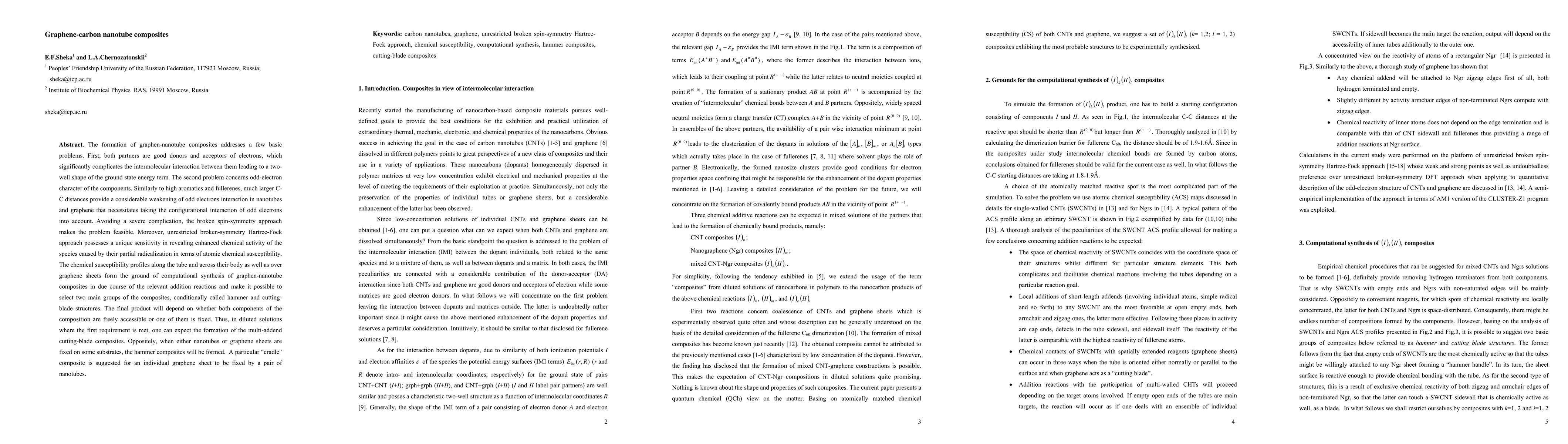 The formation of graphen-nanotube composites addresses a few basic problems. First, both partners are good donors and acceptors of electrons, which significantly complicates the intermolecular interaction between them leading to a two-well shape of the ground state energy term. The second problem concerns odd-electron character of the components. Similarly to high aromatics and fullerenes, much larger C-C distances provide a considerable weakening of odd electrons interaction in nanotubes and graphene that necessitates taking the configurational interaction of odd electrons into account. Avoiding a severe complication, the broken spin-symmetry approach makes the problem feasible. Moreover, unrestricted broken-symmetry Hartree-Fock approach possesses a unique sensitivity in revealing enhanced chemical activity of the species caused by their partial radicalization in terms of atomic chemical susceptibility. The chemical susceptibility profiles along the tube and across their body as well as over graphene sheets form the ground of computational synthesis of graphen-nanotube composites in due course of the relevant addition reactions and make it possible to select two main groups of the composites, conditionally called hammer and cutting-blade structures. The final product will depend on whether both components of the composition are freely accessible or one of them is fixed. Thus, in diluted solutions where the first requirement is met, one can expect the formation of the multi-addend cutting-blade composites. Oppositely, when either nanotubes or graphene sheets are fixed on some substrates, the hammer composites will be formed. A particular "cradle" composite is suggested for an individual graphene sheet to be fixed by a pair of nanotubes.