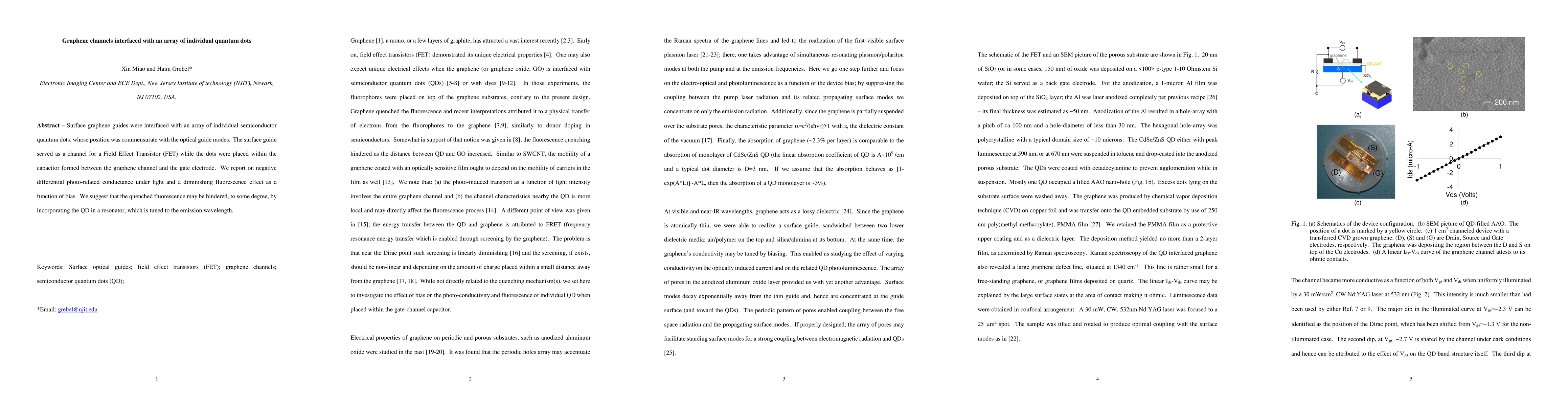 The research interfaces graphene channels with an array of individual quantum dots, utilizing graphene as an optical and electrical surface guide in an FET construction. The study examines the electrical and fluorescence properties under various conditions.