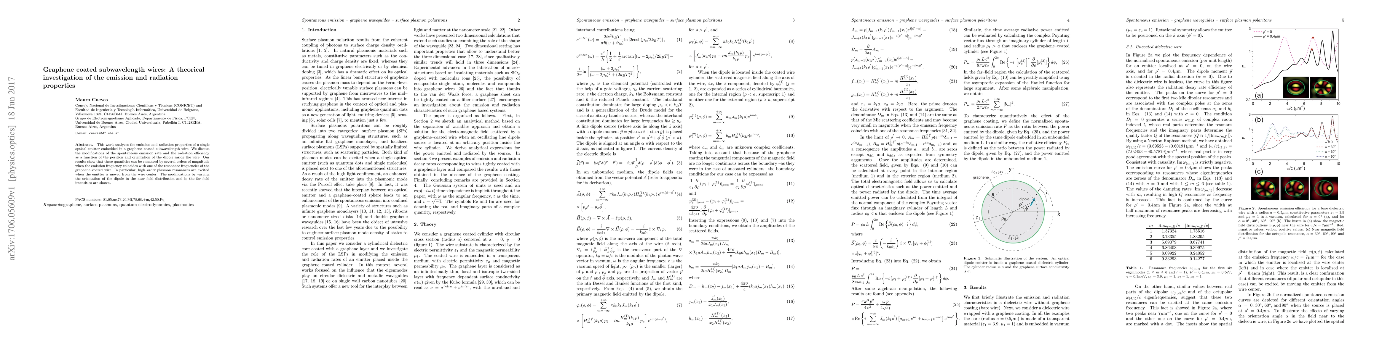 This paper investigates how graphene-coated subwavelength wires enhance the emission and radiation properties of a single optical emitter, showing significant improvements in spontaneous emission rate and radiation efficiency when the emitter's frequency matches the wire's resonance frequencies, particularly through high-order plasmon resonances. The study also examines the effects of dipole orientation on near and far field distributions.