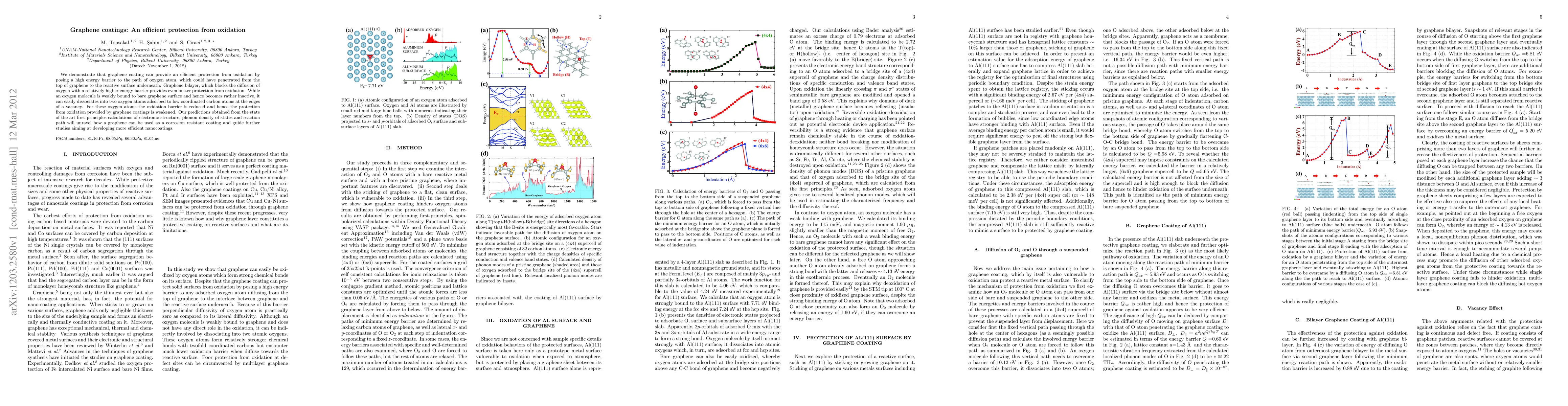 Graphene coatings effectively prevent oxidation by creating a high energy barrier for oxygen diffusion, with bilayer graphene providing superior protection. First-principles calculations reveal that while oxygen molecules are inactive on bare graphene, oxygen atoms at edge vacancies reduce the oxidation barrier, suggesting optimization strategies for enhanced corrosion resistance.