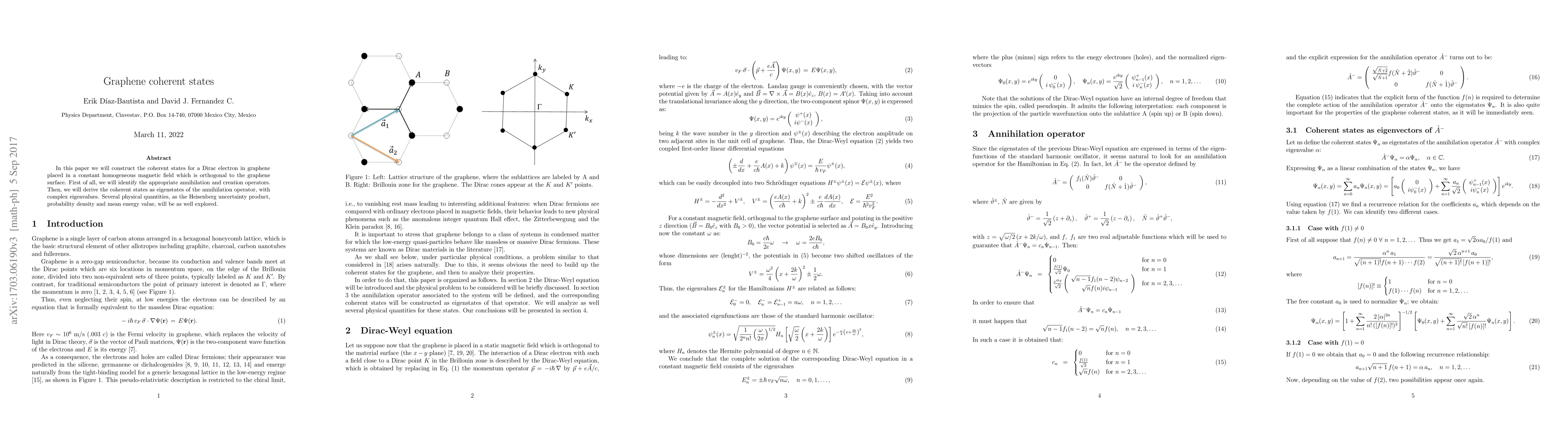 This paper constructs coherent states for Dirac electrons in graphene under a perpendicular magnetic field, identifying annihilation and creation operators, and deriving these states as eigenstates of the annihilation operator. It also explores physical quantities like the Heisenberg uncertainty product, probability density, and mean energy.