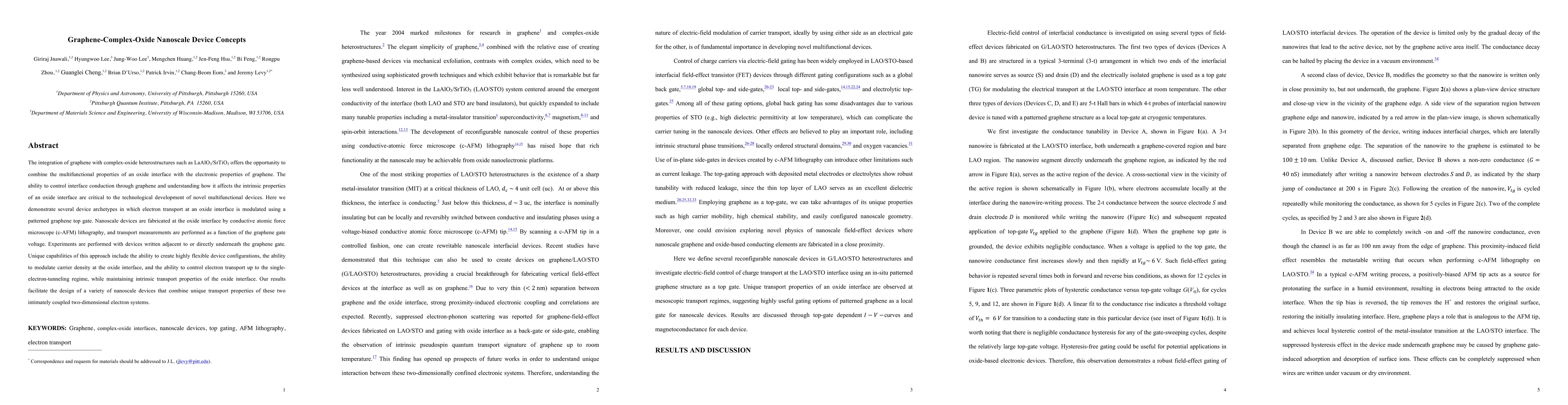 This research demonstrates the integration of graphene with complex-oxide heterostructures to create novel nanoscale devices, where electron transport at oxide interfaces is modulated by a patterned graphene top gate. The study highlights the potential for flexible device configurations, precise carrier density modulation, and single-electron-tunneling control, paving the way for multifunctional nanoscale device development.