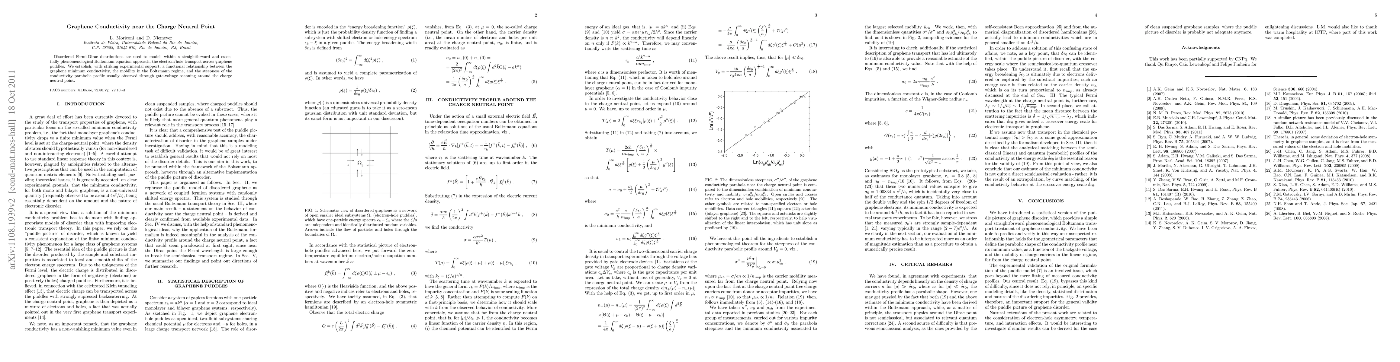Summary: The research models electron/hole transport in graphene using disordered Fermi-Dirac distributions and establishes a relationship between minimum conductivity, mobility, and the parabolic conductivity profile near the charge neutral point, supported by experimental data.