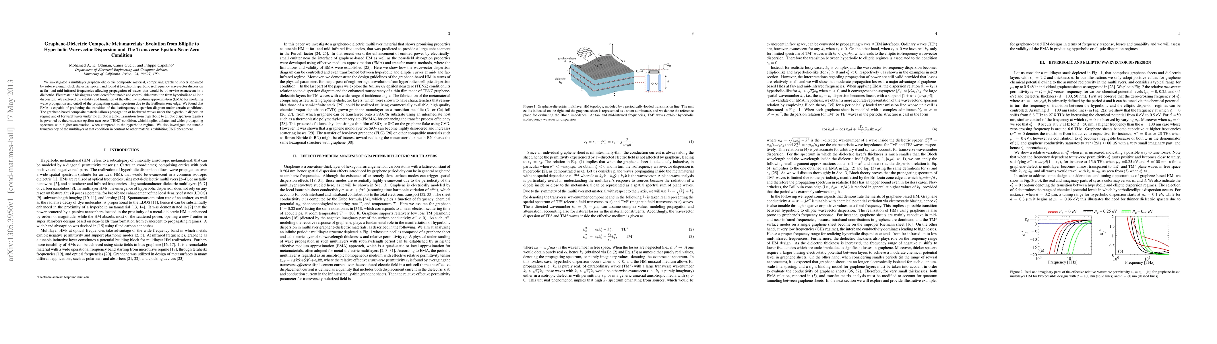 This paper explores a graphene-dielectric composite metamaterial that exhibits hyperbolic wavevector dispersion, enabling the propagation of evanescent waves. The study investigates the transition from hyperbolic to elliptic dispersion through electrostatic biasing and the transverse epsilon-near-zero (TENZ) condition, highlighting the material's tunable transparency and effective medium approximation capabilities.