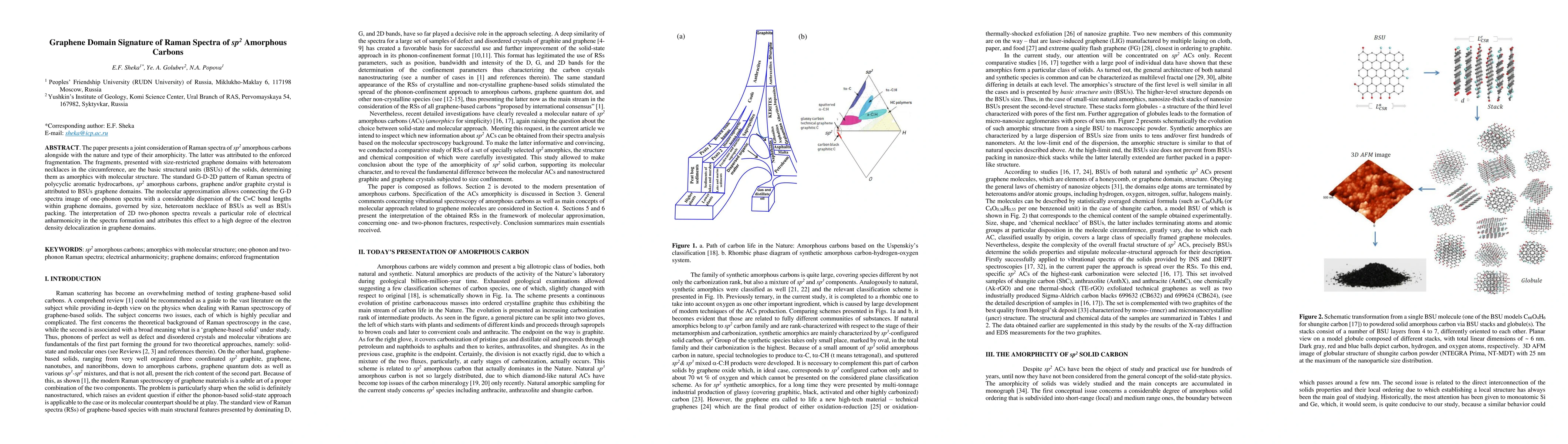The paper presents a joint consideration of Raman spectra of sp2 amorphous carbons alongside with the nature and type of their amorphicity. The latter was attributed to the enforced fragmentation. The fragments, presented with size-restricted graphene domains with heteroatom necklaces in the circumference, are the basic structural units (BSUs) of the solids, determining them as amorphics with molecular structure. The standard G-D-2D pattern of Raman spectra of polycyclic aromatic hydrocarbons, sp2 amorphous carbons, graphene and/or graphite crystal is attributed to BSUs graphene domains. The molecular approximation allows connecting the G-D spectra image of one-phonon spectra with a considerable dispersion of the C=C bond lengths within graphene domains, governed by size, heteroatom necklace of BSUs as well as BSUs packing. The interpretation of 2D two-phonon spectra reveals a particular role of electrical anharmonicity in the spectra formation and attributes this effect to a high degree of the electron density delocalization in graphene domains.