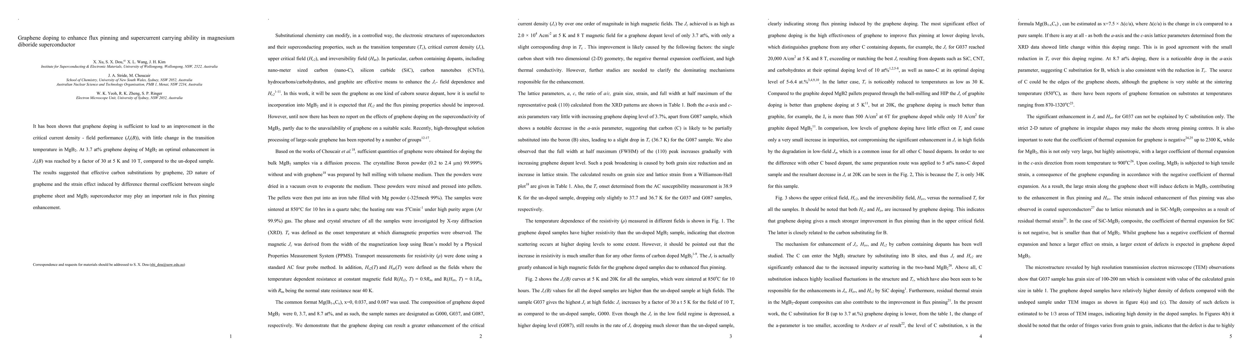 It has been shown that graphene doping is sufficient to lead to an improvement in the critical current density - field performance (Jc(B)), with little change in the transition temperature in MgB2. At 3.7 at% graphene doping of MgB2 an optimal enhancement in Jc(B) was reached by a factor of 30 at 5 K and 10 T, compared to the un-doped sample. The results suggested that effective carbon substitutions by grapheme, 2D nature of grapheme and the strain effect induced by difference thermal coefficient between single grapheme sheet and MgB2 superconductor may play an important role in flux pinning enhancement.