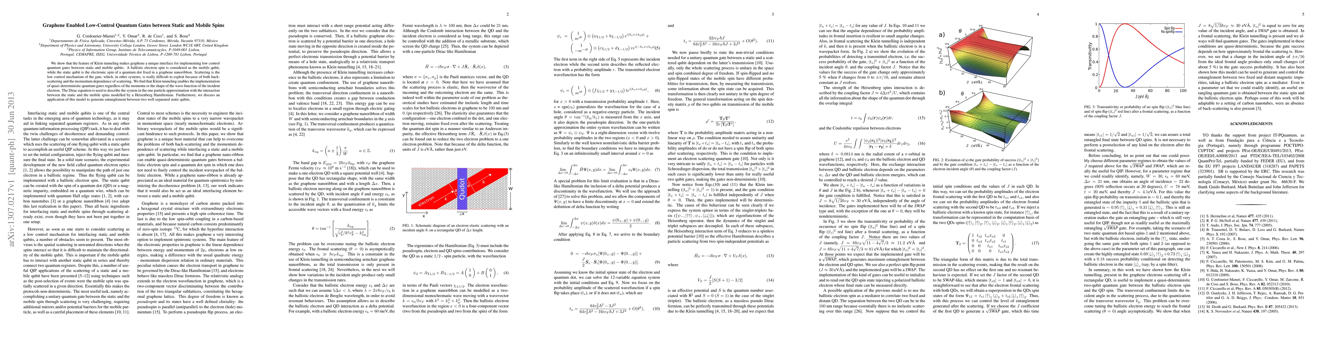 We show that the feature of Klein tunneling makes graphene a unique interface for implementing low control quantum gates between static and mobile qubits. A ballistic electron spin is considered as the mobile qubit, while the static qubit is the electronic spin of a quantum dot fixed in a graphene nanoribbon. Scattering is the low control mechanism of the gate, which, in other systems, is really difficult to exploit because of both back-scattering and the momentum dependence of scattering. We find that Klein tunneling enables the implementation of quasi-deterministic quantum gates regardless of the momenta or the shape of the wave function of the incident electron. The Dirac equation is used to describe the system in the one particle approximation with the interaction between the static and the mobile spins modelled by a Heisenberg Hamiltonian. Furthermore, we discuss an application of this model to generate entanglement between two well separated static qubits.