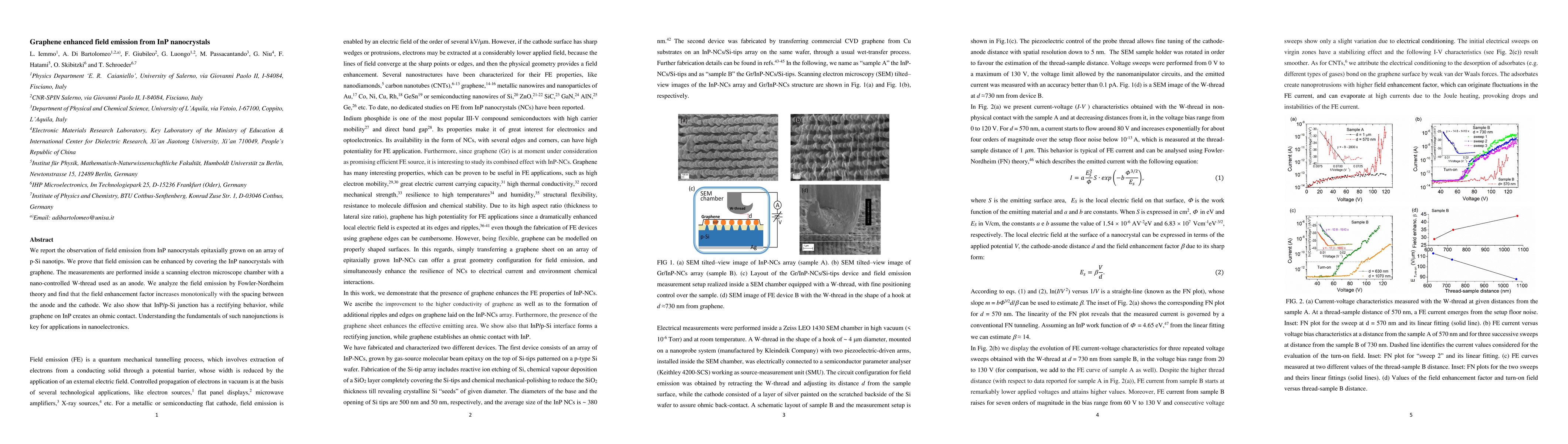 Researchers demonstrate enhanced field emission from InP nanocrystals using graphene, increasing efficiency with reduced anode-cathode spacing. The findings have implications for applications in nanoelectronics.