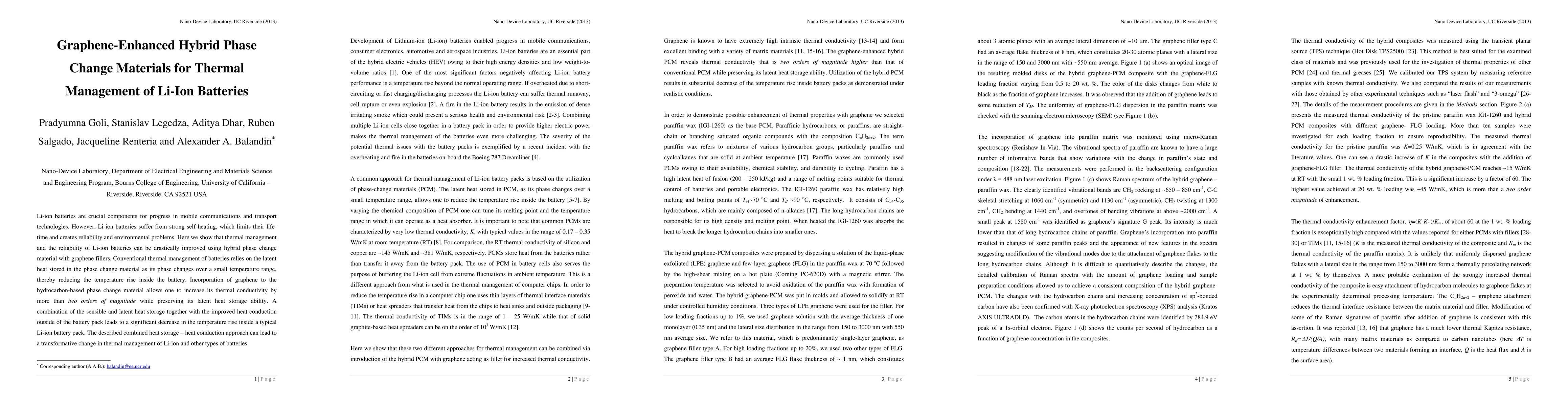 This paper demonstrates how incorporating graphene into hybrid phase change materials enhances thermal management for Li-ion batteries, significantly reducing internal temperature rise through increased thermal conductivity and maintaining latent heat storage capabilities. This approach promises transformative improvements in battery reliability and lifespan.