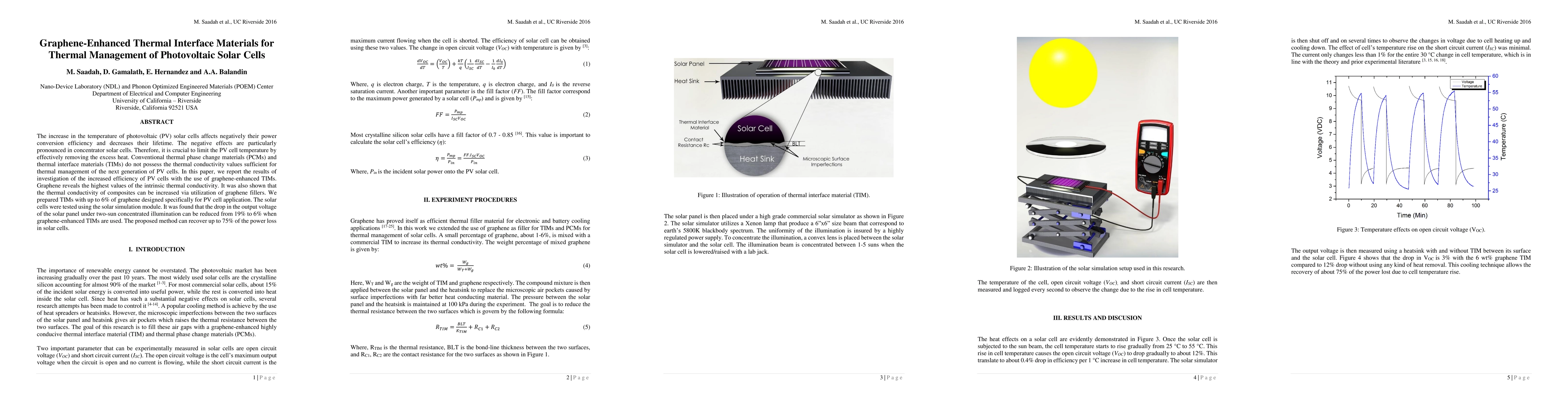This study investigates graphene-enhanced thermal interface materials (TIMs) for improving thermal management in photovoltaic solar cells, showing a significant reduction in temperature-related power loss. Graphene fillers boost thermal conductivity, reducing output voltage drop from 19% to 6% under concentrated illumination and recovering up to 75% of power loss.
