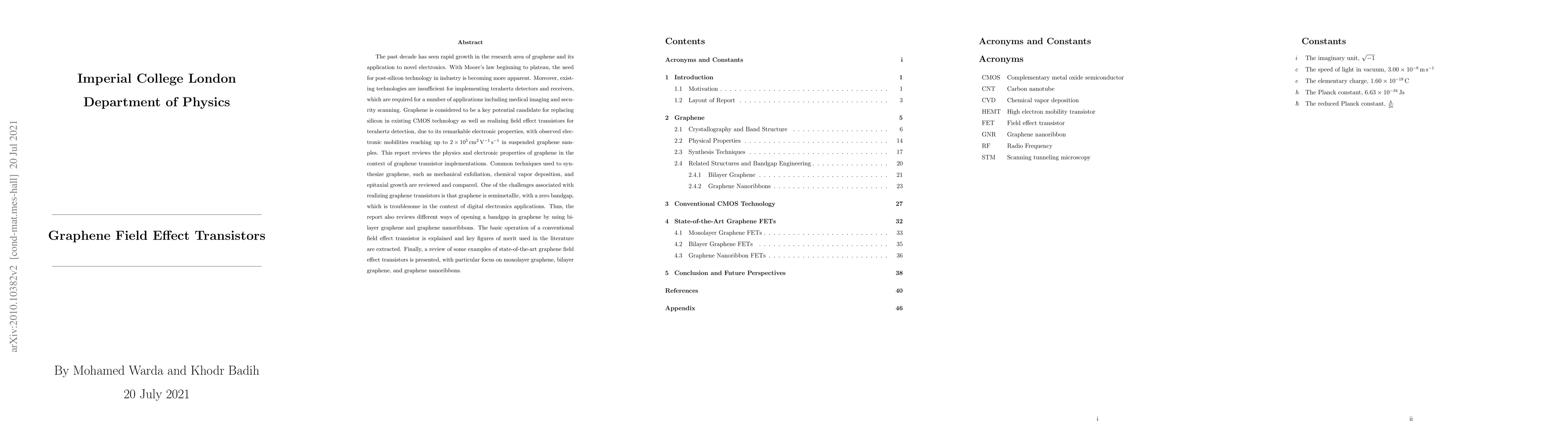 The past decade has seen rapid growth in the research area of graphene and its application to novel electronics. With Moore's law beginning to plateau, the need for post-silicon technology in industry is becoming more apparent. Moreover, existing technology is insufficient for implementing terahertz detectors and receivers, which are required for a number of applications including medical imaging and security scanning. Graphene is considered to be a key potential candidate for replacing silicon in existing CMOS technology as well as realizing field effect transistors for terahertz detection, due to its remarkable electronic properties, with observed electronic mobilities reaching up to $2 \times 10^5$ cm$^2$ V$^{-1}$ s$^{-1}$ in suspended graphene samples. This report reviews the physics and electronic properties of graphene in the context of graphene transistor implementations. Common techniques used to synthesize graphene, such as mechanical exfoliation, chemical vapor deposition, and epitaxial growth are reviewed and compared. One of the challenges associated with realizing graphene transistors is that graphene is semimetallic, with a zero bandgap, which is troublesome in the context of digital electronics applications. Thus, the report also reviews different ways of opening a bandgap in graphene by using bilayer graphene and graphene nanoribbons. The basic operation of a conventional field effect transistor is explained and key figures of merit used in the literature are extracted. Finally, a review of some examples of state-of-the-art graphene field effect transistors is presented, with particular focus on monolayer graphene, bilayer graphene, and graphene nanoribbons.