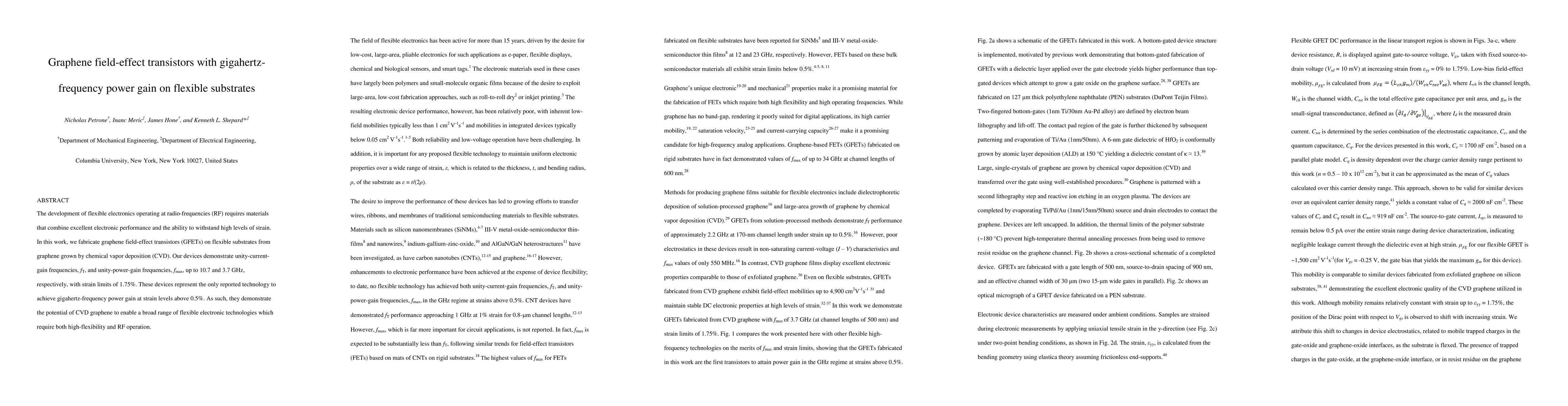 Researchers fabricate graphene field-effect transistors (GFETs) on flexible substrates, achieving gigahertz-frequency power gain with fT up to 10.7 GHz and fmax up to 3.7 GHz, showcasing CVD graphene's potential for flexible RF electronics. These devices are the first to demonstrate such performance at strain levels above 0.5%.