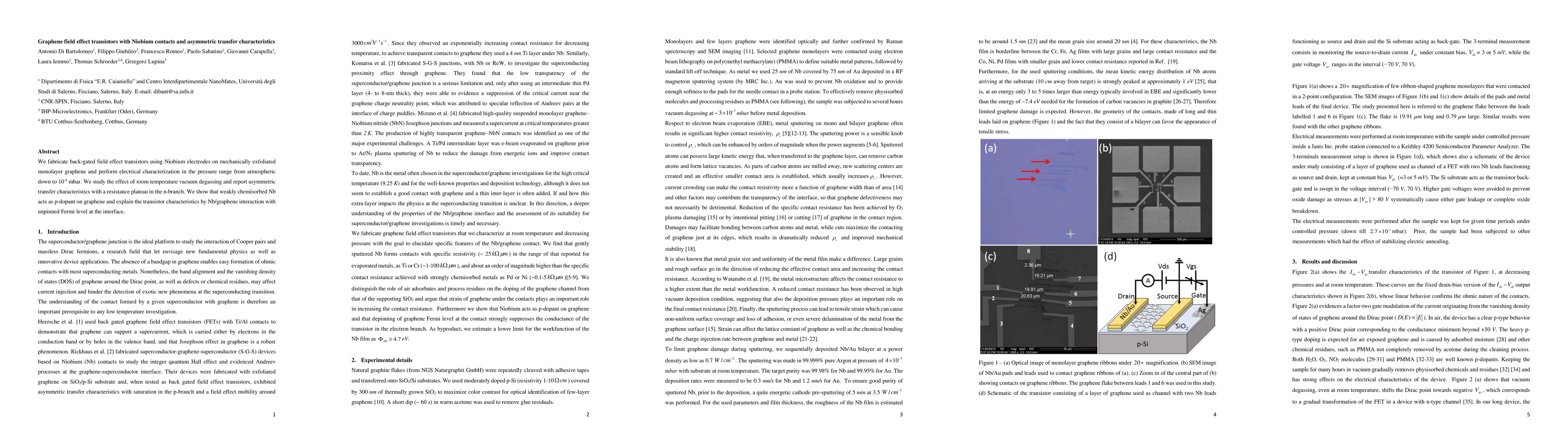 Summary: The study fabricates graphene field effect transistors with Niobium contacts, revealing asymmetric transfer characteristics and a resistance plateau due to weakly chemisorbed Nb acting as a p-dopant. The interaction between Nb and graphene causes an unpinned Fermi level at the interface, influencing the transistor's behavior.