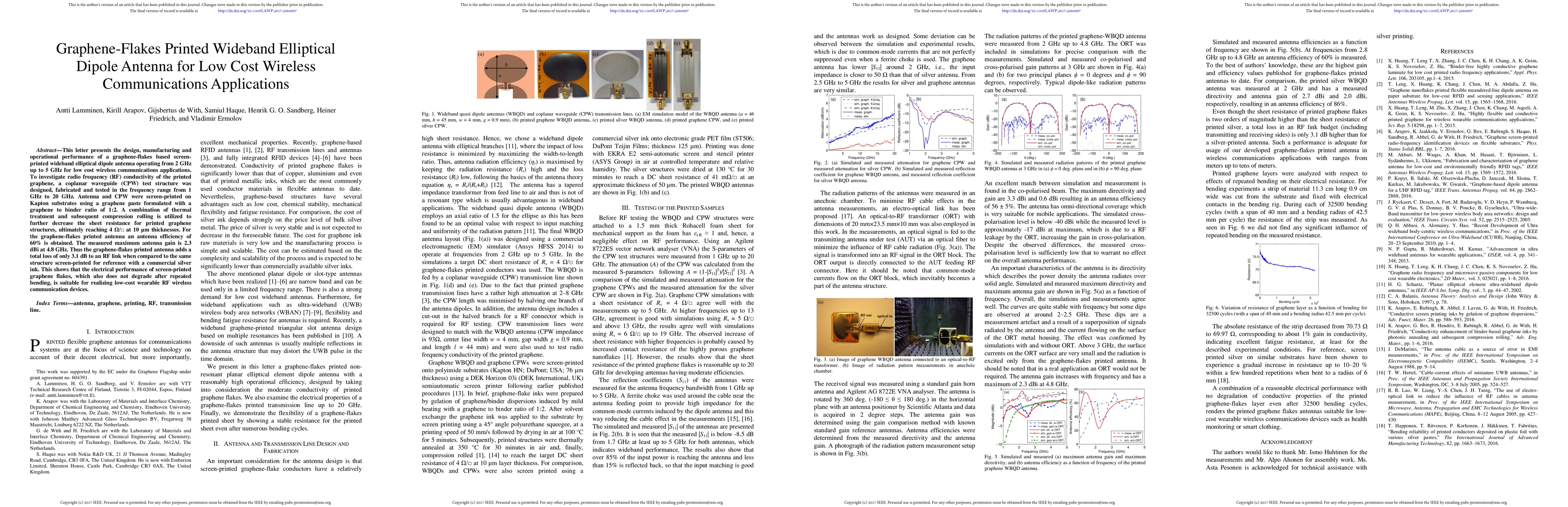 This letter presents the design, manufacturing and operational performance of a graphene-flakes based screenprinted wideband elliptical dipole antenna operating from 2 GHz up to 5 GHz for low cost wireless communications applications. To investigate radio frequency (RF) conductivity of the printed graphene, a coplanar waveguide (CPW) test structure was designed, fabricated and tested in the frequency range from 1 GHz to 20 GHz. Antenna and CPW were screen-printed on Kapton substrates using a graphene paste formulated with a graphene to binder ratio of 1:2. A combination of thermal treatment and subsequent compression rolling is utilized to further decrease the sheet resistance for printed graphene structures, ultimately reaching 4 Ohm/sq. at 10 {\mu}m thicknesses. For the graphene-flakes printed antenna an antenna efficiency of 60% is obtained. The measured maximum antenna gain is 2.3 dBi at 4.8 GHz. Thus the graphene-flakes printed antenna adds a total loss of only 3.1 dB to an RF link when compared to the same structure screen-printed for reference with a commercial silver ink. This shows that the electrical performance of screen-printed graphene flakes, which also does not degrade after repeated bending, is suitable for realizing low-cost wearable RF wireless communication devices.