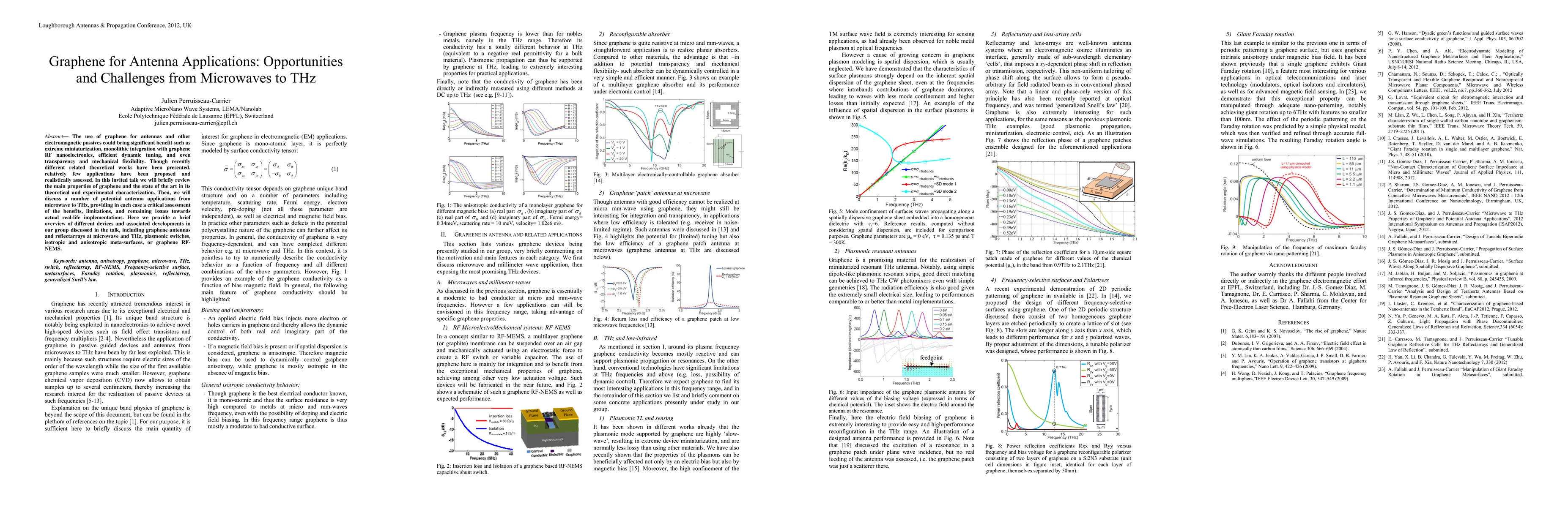 The use of graphene for antennas and other electromagnetic passives could bring significant benefit such as extreme miniaturization, monolithic integration with graphene RF nanoelectronics, efficient dynamic tuning, and even transparency and mechanical flexibility. Though recently different related theoretical works have been presented, relatively few applications have been proposed and realistically assessed. In this invited talk we will briefly review the main properties of graphene and the state of the art in its theoretical and experimental characterization. Then, we will discuss a number of potential antenna applications from microwave to THz, providing in each case a critical assessment of the benefits, limitations, and remaining issues towards actual real-life implementations. Here we provide a brief overview of different devices and associated developments in our group discussed in the talk, including graphene antennas and reflectarrays at microwave and THz, plasmonic switches, isotropic and anisotropic meta-surfaces, or graphene RF-NEMS.