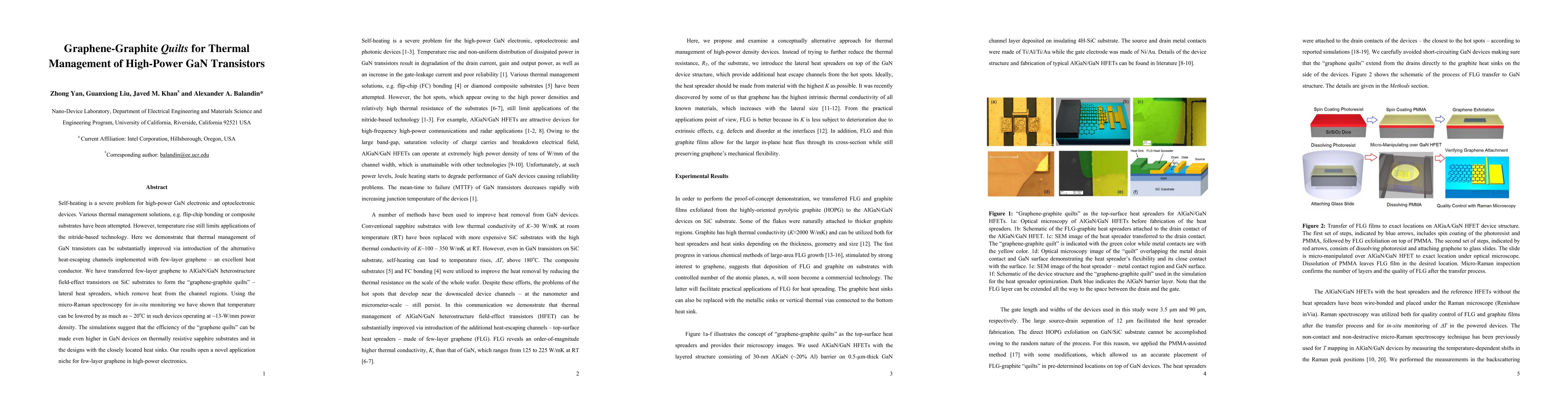 This study introduces "graphene-graphite quilts" to significantly enhance thermal management in high-power GaN transistors, achieving up to a 20°C temperature reduction at 13-W/mm power density. The potential for further efficiency improvements in sapphire substrate and closely located heat sink designs highlights graphene's novel application in high-power electronics.