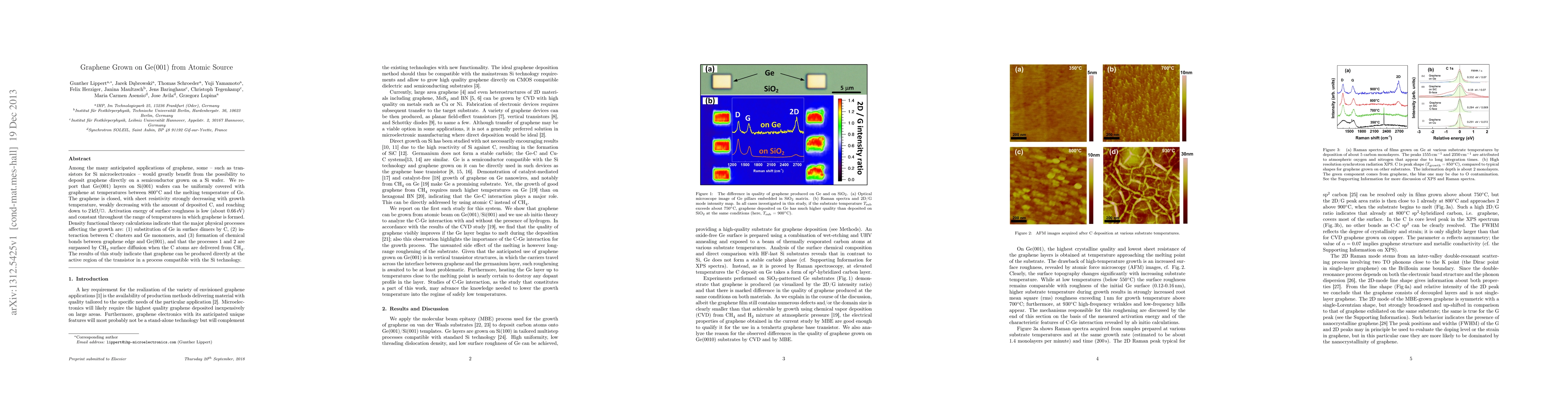 Graphene was grown on Ge(001) layers on Si(001) wafers using reduced pressure chemical vapor deposition in a two-step process. The growth temperature varied between 350°C and 930°C, with a growth rate of approximately 1.4 graphene monolayer per minute. Characterization techniques included μ-Raman spectroscopy, X-ray photoelectron spectroscopy (XPS), atomic force microscopy (AFM), and four-tip scanning tunneling microscopy (4-tip STM) combined with scanning electron microscopy (SEM). Density functional theory (DFT) calculations were performed to understand the growth mechanisms.