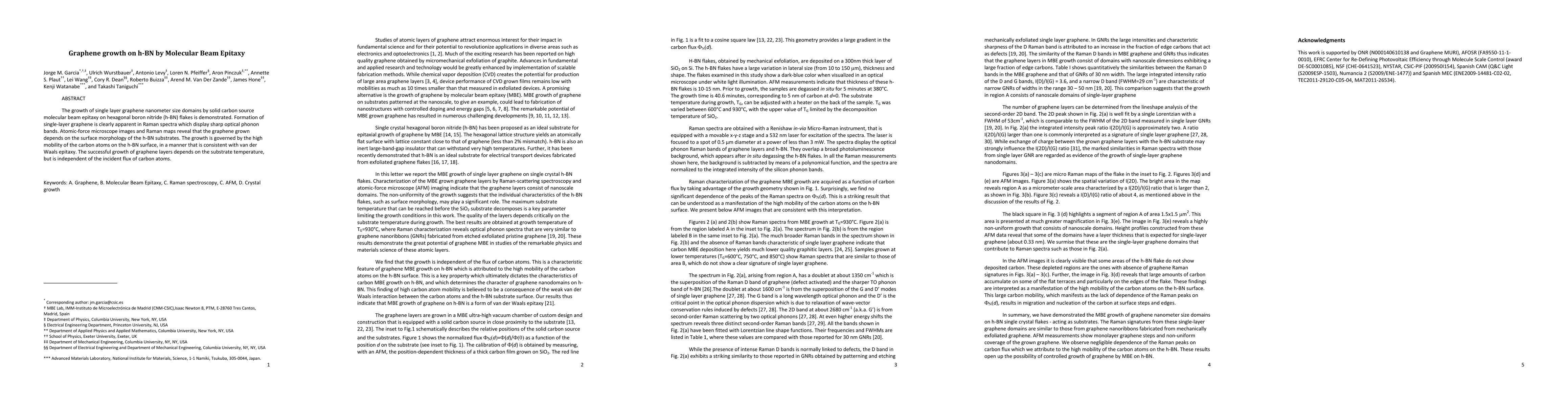 Summary: This study demonstrates the growth of single-layer graphene nanodomains on hexagonal boron nitride (h-BN) substrates using molecular beam epitaxy, showing dependence on h-BN surface morphology and substrate temperature. Raman spectra confirm the formation of high-quality graphene, with growth governed by van der Waals epitaxy.