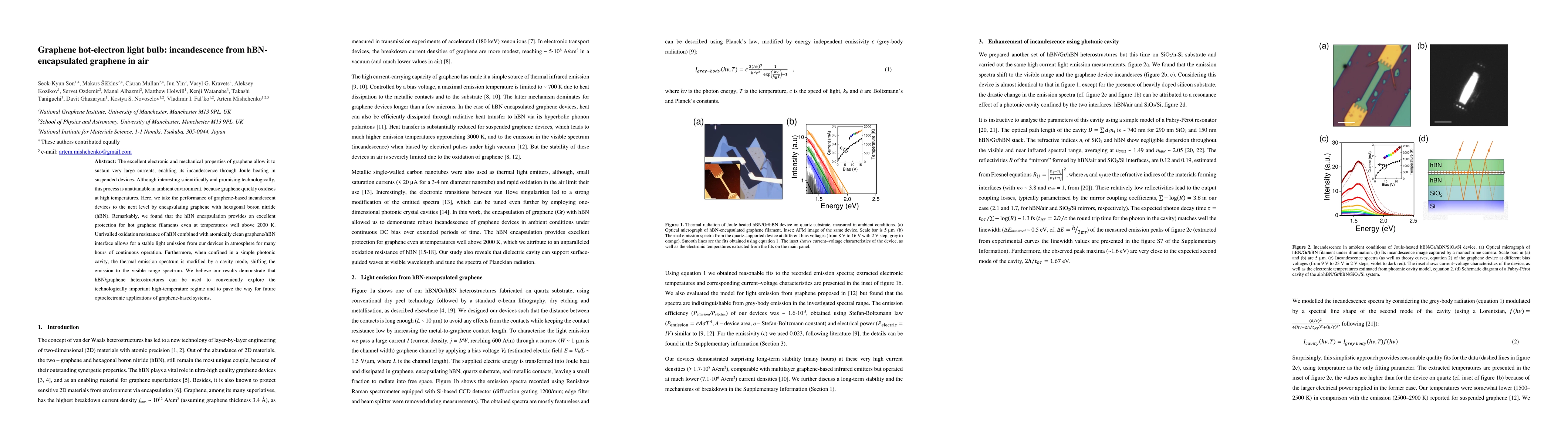 This paper demonstrates the successful incandescence of graphene in air by encapsulating it with hexagonal boron nitride (hBN), which protects it from oxidation at high temperatures. The hBN/graphene heterostructures enable stable light emission and modify the thermal emission spectrum when confined in photonic cavities, paving the way for future optoelectronic applications.