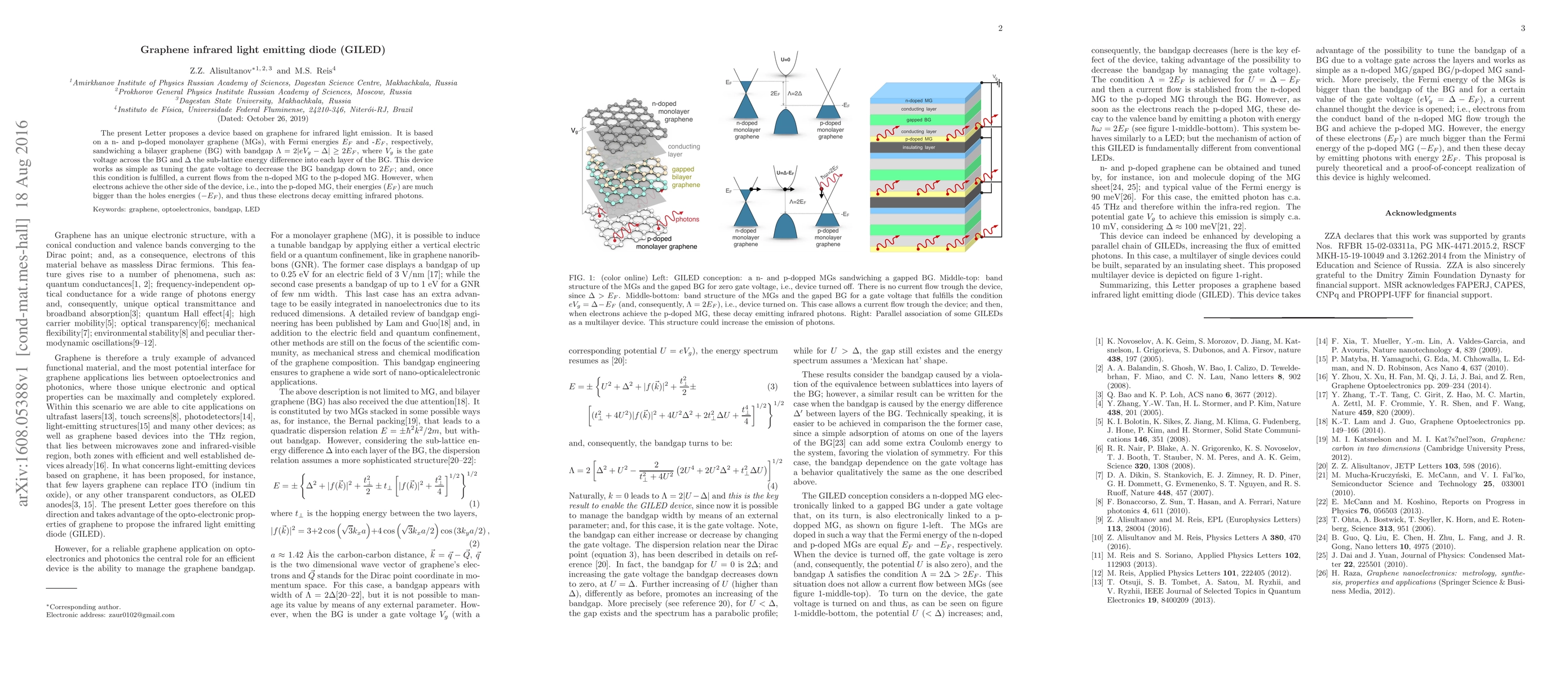 A graphene-based infrared light emitting diode (GILED) device is proposed, which emits infrared photons when electrons from a n-doped monolayer graphene cross into a p-doped monolayer graphene, exciting the bilayer graphene and resulting in photon emission.