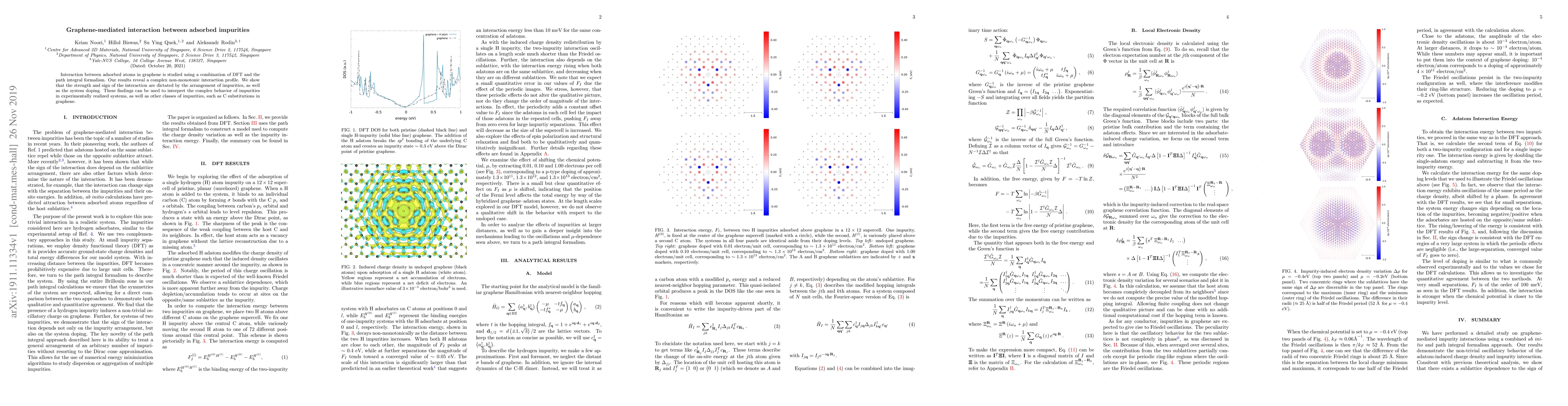 This research investigates the interaction between adsorbed impurities on graphene using DFT and path integral formalism, revealing a complex non-monotonic interaction profile that varies with impurity arrangement and system doping. These insights can help interpret impurity behaviors in experimental graphene systems.