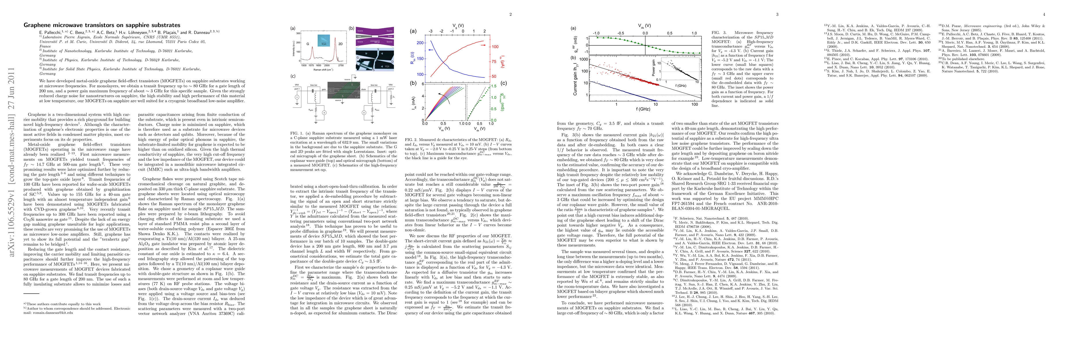 This paper presents metal-oxide graphene field-effect transistors (MOGFETs) on sapphire substrates operating at microwave frequencies, achieving a transit frequency of up to 80 GHz and a power gain maximum frequency of 3 GHz, demonstrating their suitability for cryogenic broadband low-noise amplifier applications.