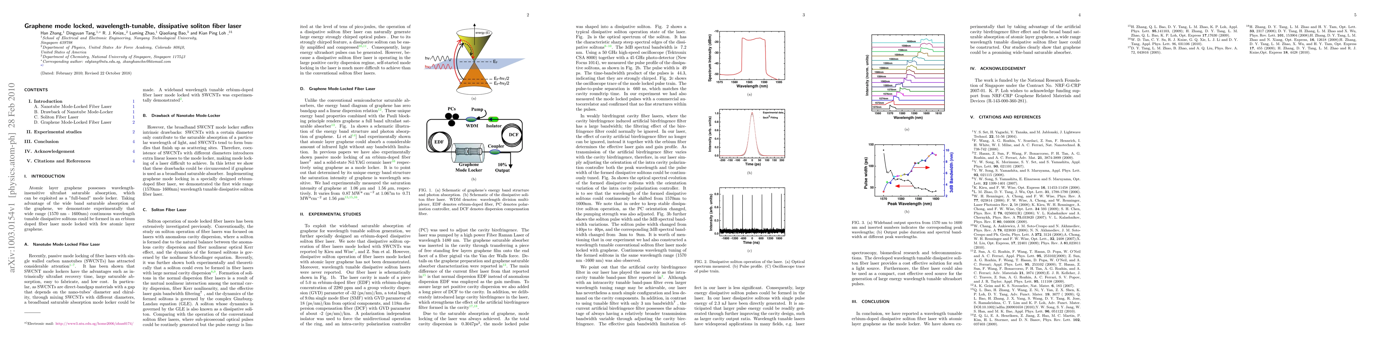 Summary: This paper demonstrates an erbium-doped fiber laser mode-locked with few-layer graphene, showing wavelength-insensitive ultrafast saturable absorption to generate continuous wavelength tunable dissipative solitons from 1570 nm to 1600 nm.