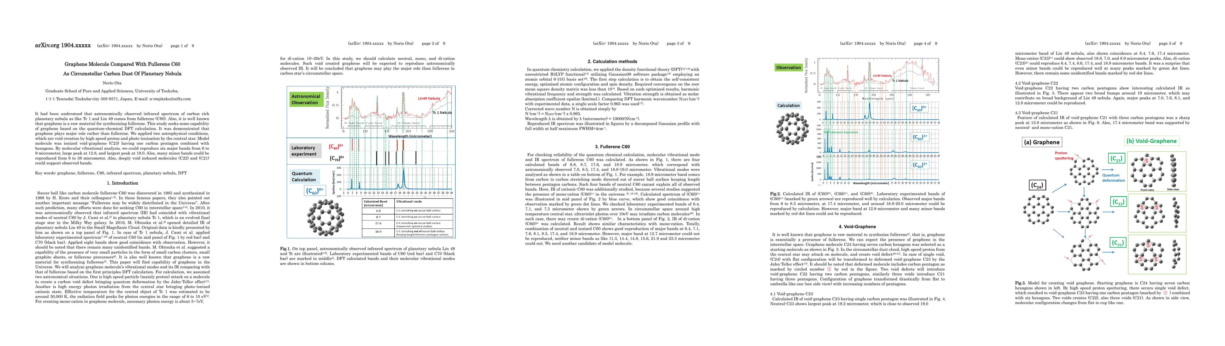 It had been understood that astronomically observed infrared spectrum of carbon rich planetary nebula as like Tc 1 and Lin 49 comes from fullerene (C60). Also, it is well known that graphene is a raw material for synthesizing fullerene. This study seeks some capability of graphene based on the quantum-chemical DFT calculation. It was demonstrated that graphene plays major role rather than fullerene. We applied two astrophysical conditions, which are void creation by high speed proton and photo-ionization by the central star. Model molecule was ionized void-graphene (C23) having one carbon pentagon combined with hexagons. By molecular vibrational analysis, we could reproduce six major bands from 6 to 9 micrometer, large peak at 12.8, and largest peak at 19.0. Also, many minor bands could be reproduced from 6 to 38 micrometer. Also, deeply void induced molecules (C22) and (C21) could support observed bands.