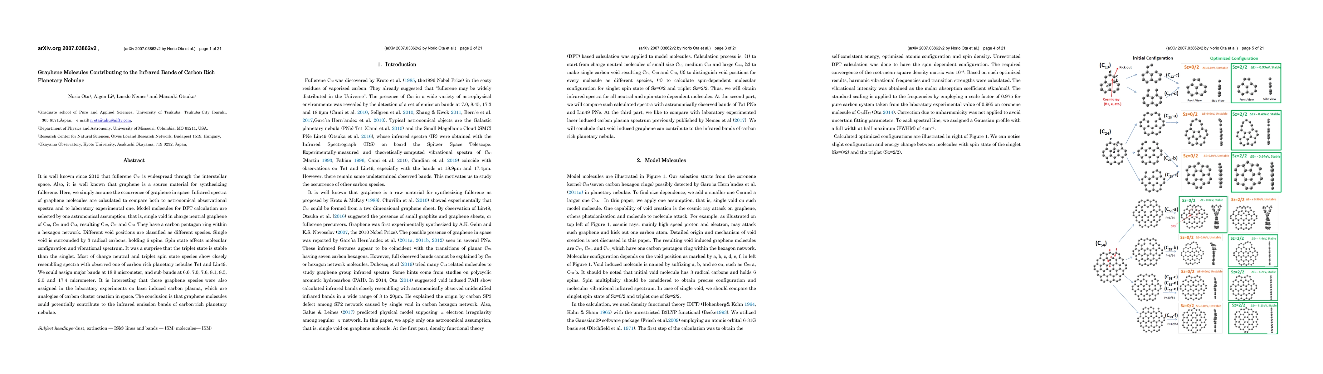 It is well known since 2010 that fullerene C60 is widespread through the interstellar space. Also, it is well known that graphene is a source material for synthesizing fullerene. Here, we simply assume the occurrence of graphene in space. Infrared spectra of graphene molecules are calculated to compare both to astronomical observational spectra and to laboratory experimental one. Model molecules for DFT calculation are selected by one astronomical assumption, that is, single void in charge neutral graphene of C13, C24 and C54, resulting C12, C23 and C53. They have a carbon pentagon ring within a hexagon network. Different void positions are classified as different species. Single void is surrounded by 3 radical carbons, holding 6 spins. Spin state affects molecular configuration and vibrational spectrum. It was a surprise that the triplet state is stable than the singlet. Most of charge neutral and triplet spin state species show closely resembling spectra with observed one of carbon rich planetary nebulae Tc1 and Lin49. We could assign major bands at 18.9 micrometer, and sub-bands at 6.6, 7.0, 7.6, 8.1, 8.5, 9.0 and 17.4 micrometer. It is interesting that those graphene species were also assigned in the laboratory experiments on laser-induced carbon plasma, which are analogies of carbon cluster creation in space. The conclusion is that graphene molecules could potentially contribute to the infrared emission bands of carbon-rich planetary nebulae.