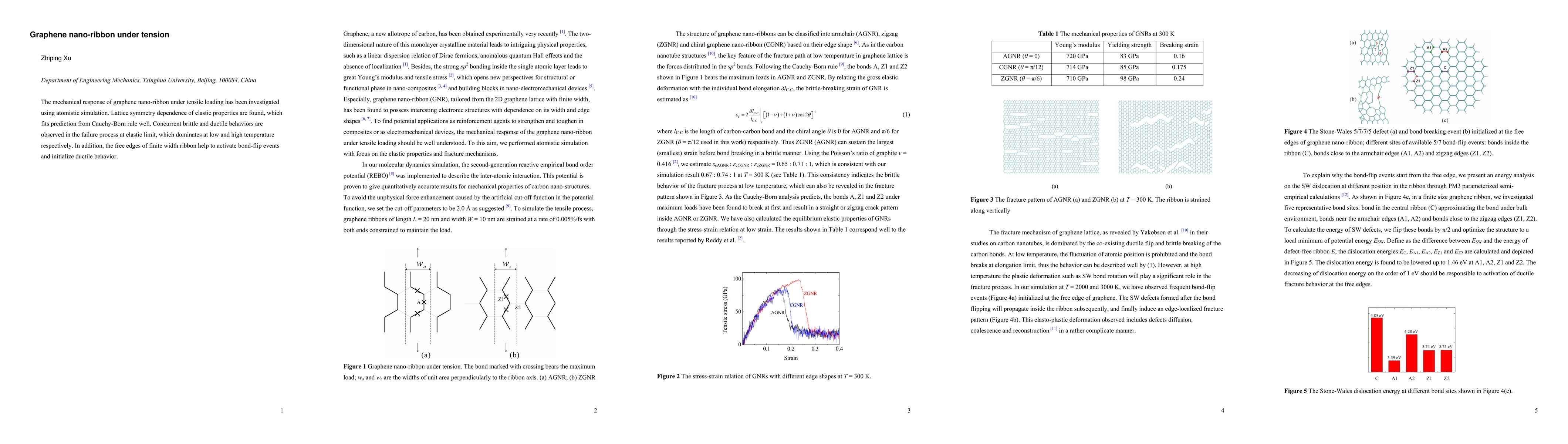 The mechanical response of graphene nano-ribbon under tensile loading has been investigated using atomistic simulation. Lattice symmetry dependence of elastic properties are found, which fits prediction from Cauchy-Born rule well. Concurrent brittle and ductile behaviors are observed in the failure process at elastic limit, which dominates at low and high temperature respectively. In addition, the free edges of finite width ribbon help to activate bond-flip events and initialize ductile behavior.