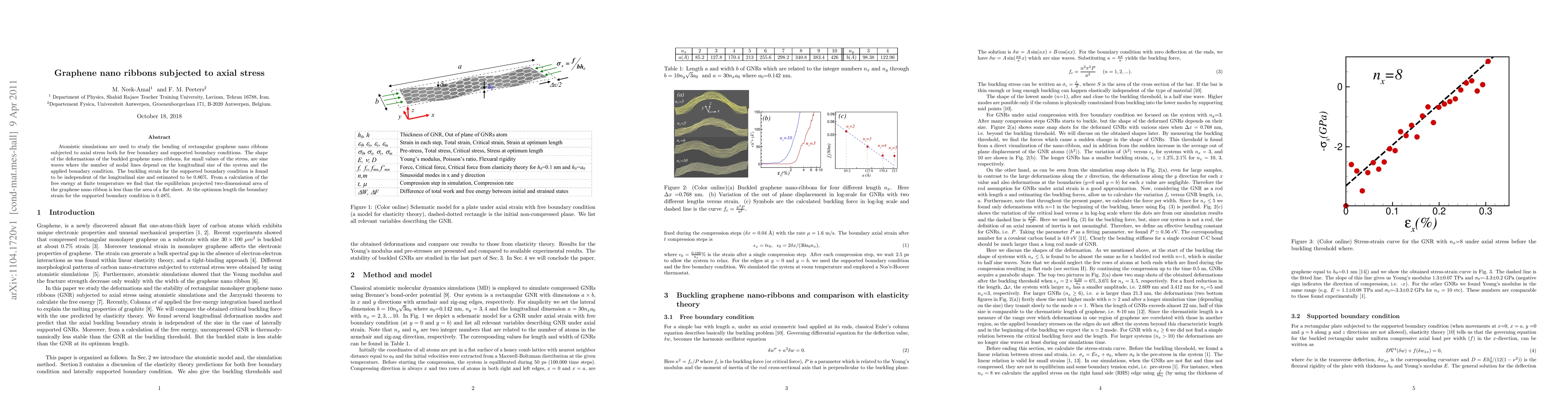 **Summary:** Atomistic simulations reveal that graphene nano ribbons bend into sine waves under axial stress, with buckling strain independent of size for supported boundaries at 0.86%. Equilibrium area for the ribbon is smaller than a flat sheet, with optimal boundary strain at 0.48%.