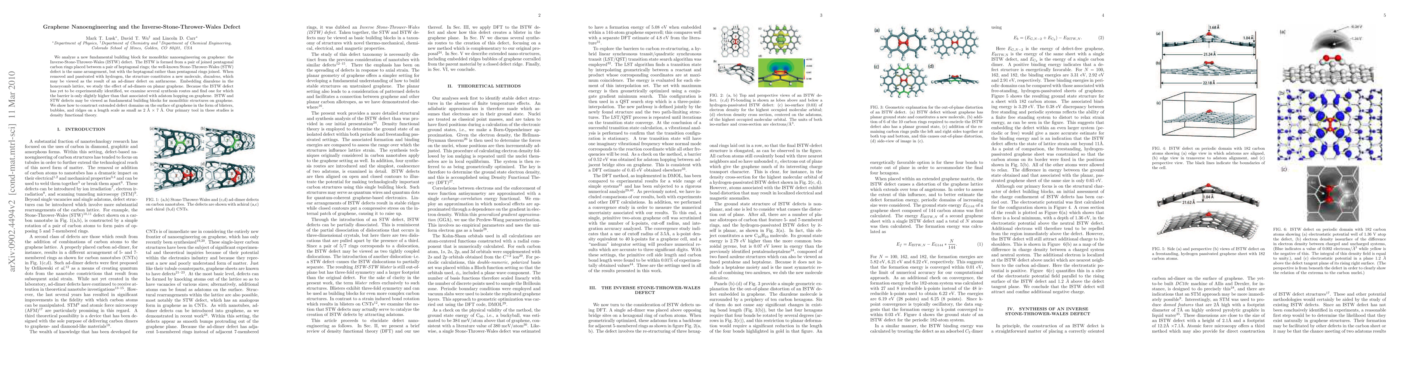We analyze a new fundamental building block for monolithic nanoengineering on graphene: the Inverse-Stone-Thrower-Wales (ISTW) defect. The ISTW is formed from a pair of joined pentagonal carbon rings placed between a pair of heptagonal rings; the well-known Stone-Thrower-Wales (STW) defect is the same arrangement, but with the heptagonal rather than pentagonal rings joined. When removed and passivated with hydrogen, the structure constitutes a new molecule, diazulene, which may be viewed as the result of an ad-dimer defect on anthracene. Embedding diazulene in the honeycomb lattice, we study the effect of ad-dimers on planar graphene. Because the ISTW defect has yet to be experimentally identified, we examine several synthesis routes and find one for which the barrier is only slightly higher than that associated with adatom hopping on graphene. ISTW and STW defects may be viewed as fundamental building blocks for monolithic structures on graphene. We show how to construct extended defect domains on the surface of graphene in the form of blisters, bubbles, and ridges on a length scale as small as 2 angstroms by 7 angstroms. Our primary tool in these studies is density functional theory.