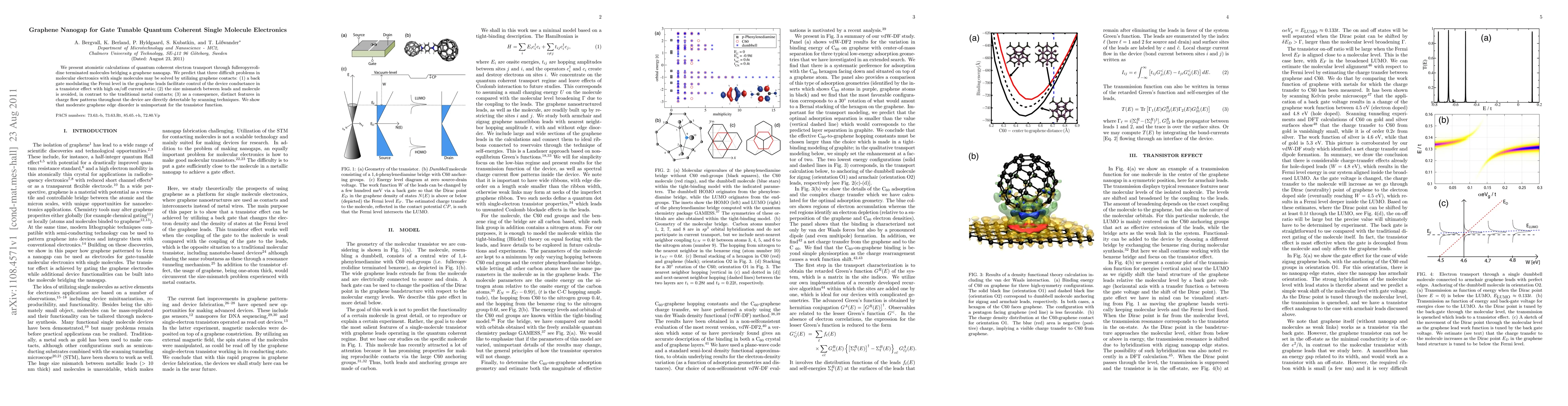 We present atomistic calculations of quantum coherent electron transport through fulleropyrrolidine terminated molecules bridging a graphene nanogap. We predict that three difficult problems in molecular electronics with single molecules may be solved by utilizing graphene contacts: (1) a back gate modulating the Fermi level in the graphene leads facilitate control of the device conductance in a transistor effect with high on/off current ratio; (2) the size mismatch between leads and molecule is avoided, in contrast to the traditional metal contacts; (3) as a consequence, distinct features in charge flow patterns throughout the device are directly detectable by scanning techniques. We show that moderate graphene edge disorder is unimportant for the transistor function.