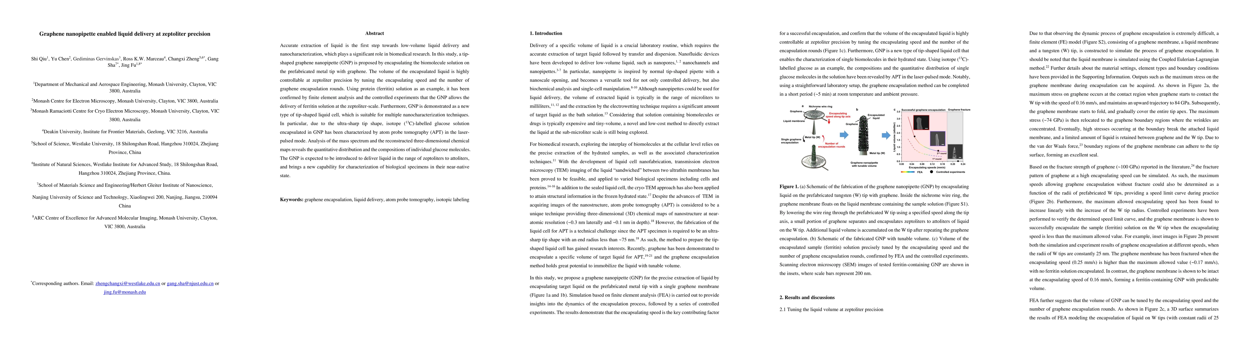 This study introduces a graphene nanopipette (GNP) for precise liquid delivery at zeptoliter scale, enabling low-volume liquid extraction and nanocharacterization in biomedical research. The GNP encapsulates liquid with zeptoliter precision, demonstrated through controlled delivery of ferritin solution and characterization of isotope-labelled glucose using atom probe tomography.