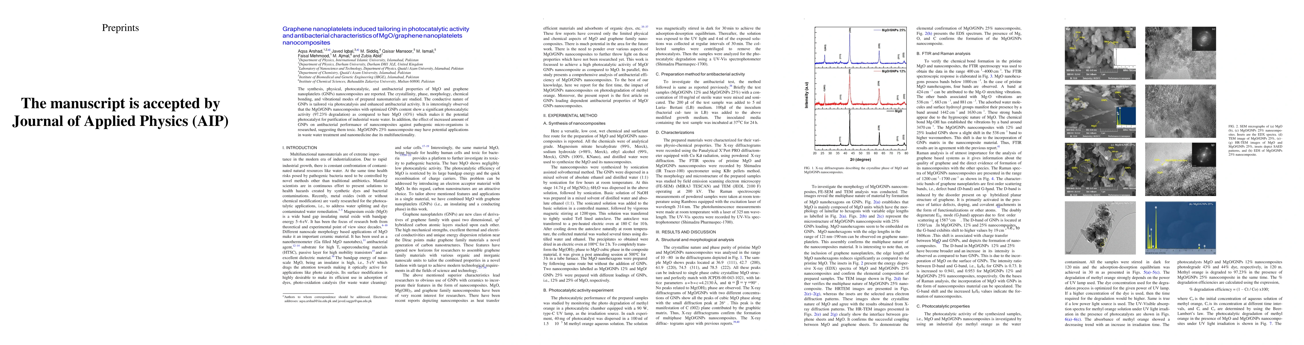 This research explores MgO/graphene nanoplatelets nanocomposites, demonstrating that optimal GNPs content enhances photocatalytic efficiency (97.23% degradation) and antibacterial properties, making it promising for wastewater treatment and nanomedicine applications.