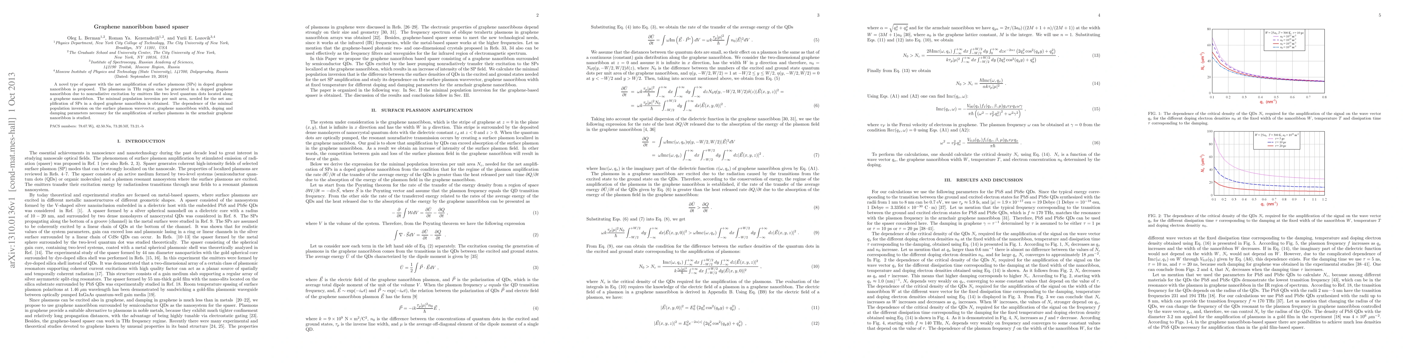 This paper proposes a novel spaser utilizing doped graphene nanoribbons to amplify surface plasmons in the THz region, driven by nonradiative excitation from quantum dots. It investigates the minimal population inversion required for this amplification and examines the effects of various parameters on the efficiency of surface plasmon generation.