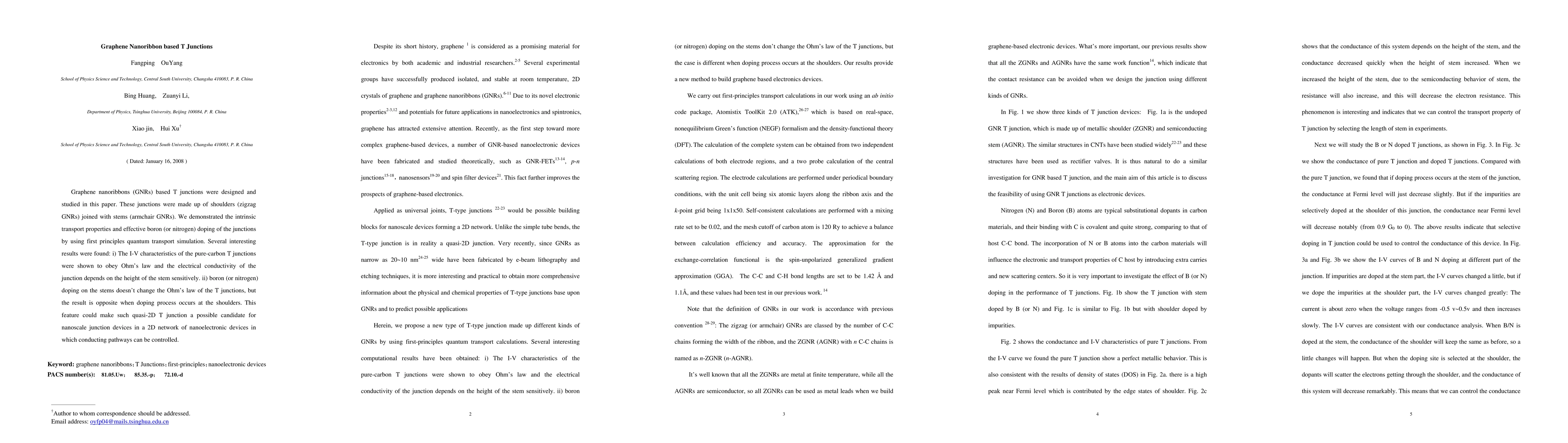 This research presents Graphene nanoribbon T junctions made of zigzag and armchair GNRs, showing Ohmic behavior with conductivity influenced by stem height. Boron/nitrogen doping on stems maintains Ohmic behavior, while shoulder doping disrupts it, suggesting potential for nanoscale device control in 2D electronics.
