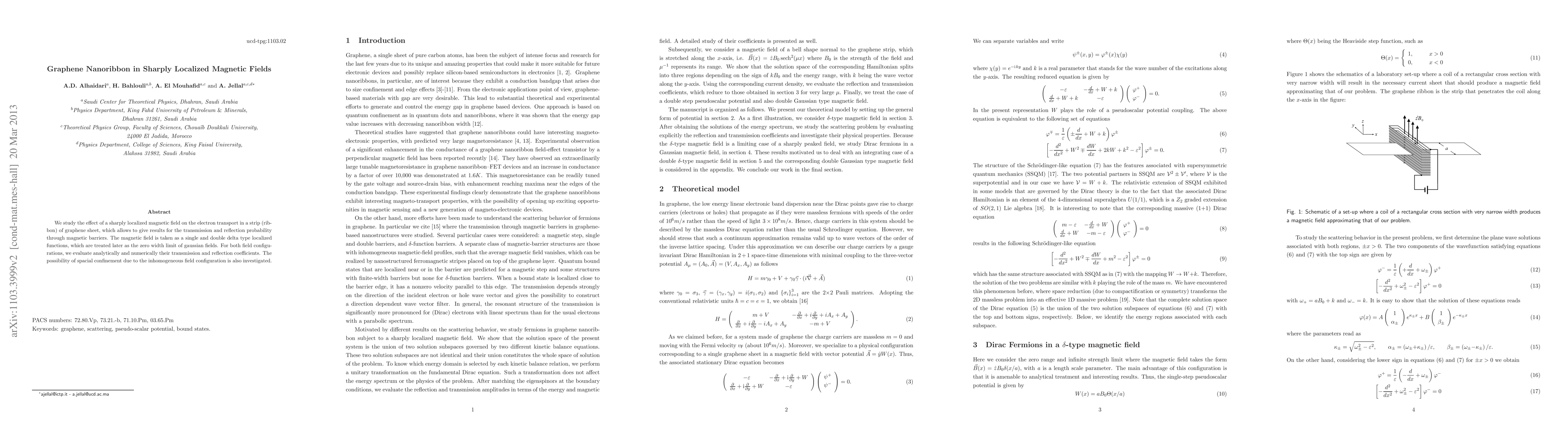 This research analyzes how a highly concentrated magnetic field impacts electron movement in a narrow graphene sheet. Using delta and gaussian magnetic field models, the study calculates transmission and reflection probabilities. It also explores the potential for spatial confinement caused by the uneven field distribution.