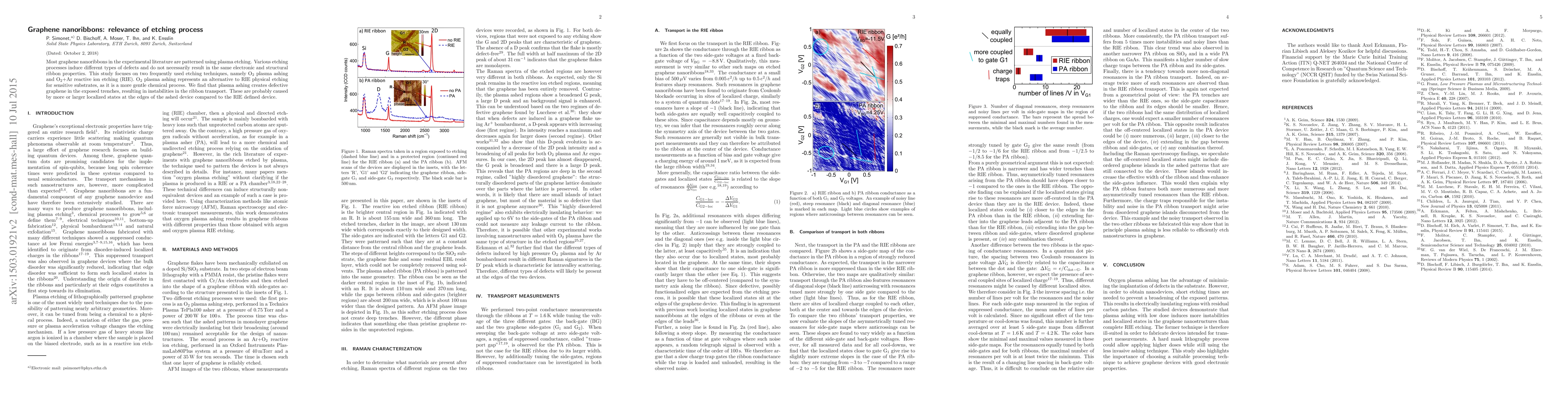 Most graphene nanoribbons in the experimental literature are patterned using plasma etching. Various etching processes induce different types of defects and do not necessarily result in the same electronic and structural ribbon properties. This study focuses on two frequently used etching techniques, namely oxygen plasma ashing and oxygen/argon reactive ion etching (RIE). Oxygen plasma ashing represents an alternative to RIE physical etching for sensitive substrates, as it is a more gentle chemical process. We find that plasma ashing creates defective graphene in the exposed trenches, resulting in instabilities in the ribbon transport. These are probably caused by more or larger localized states at the edges of the ashed device compared to the RIE defined device.
