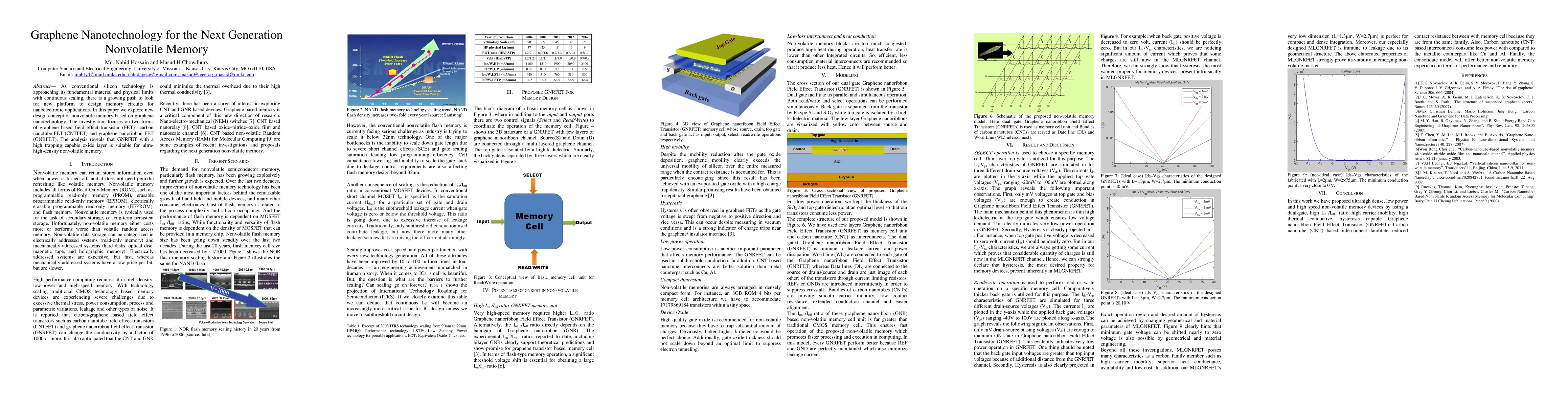 This paper proposes a new nonvolatile memory design based on graphene nanotechnology, specifically exploring carbon nanotube FET (CNTFET) and graphene nanoribbon FET (GNRFET) structures. The study finds that GNRFETs with high trapping oxide layers are promising for ultra-high density nonvolatile memory.