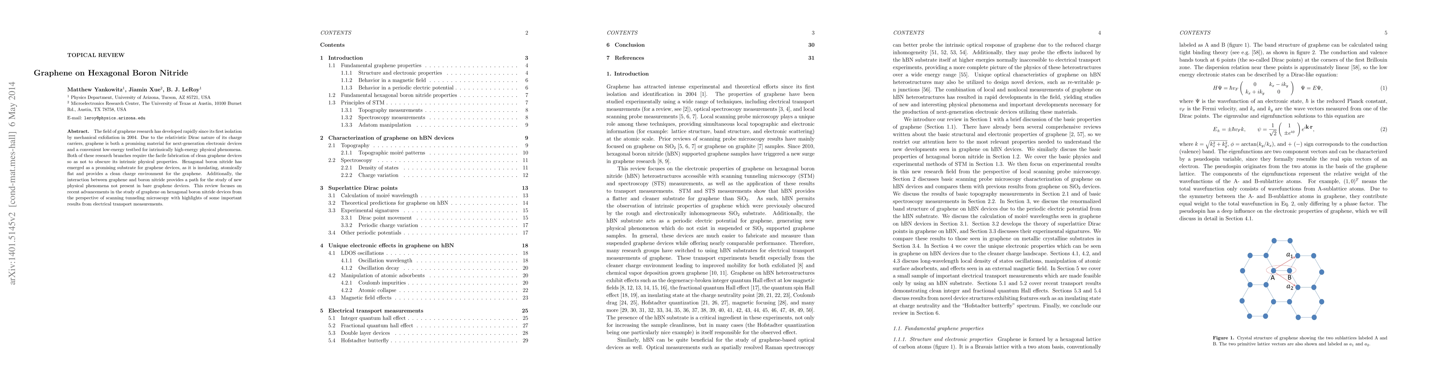 The field of graphene research has developed rapidly since its first isolation by mechanical exfoliation in 2004. Due to the relativistic Dirac nature of its charge carriers, graphene is both a promising material for next-generation electronic devices and a convenient low-energy testbed for intrinsically high-energy physical phenomena. Both of these research branches require the facile fabrication of clean graphene devices so as not to obscure its intrinsic physical properties. Hexagonal boron nitride has emerged as a promising substrate for graphene devices, as it is insulating, atomically flat and provides a clean charge environment for the graphene. Additionally, the interaction between graphene and boron nitride provides a path for the study of new physical phenomena not present in bare graphene devices. This review focuses on recent advancements in the study of graphene on hexagonal boron nitride devices from the perspective of scanning tunneling microscopy with highlights of some important results from electrical transport measurements.