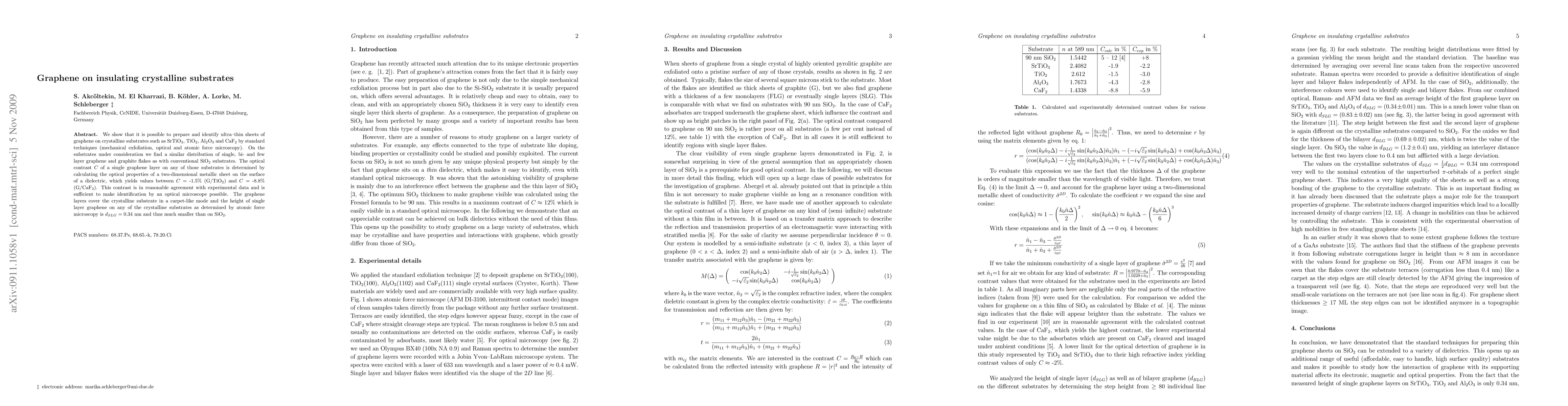 We show that it is possible to prepare and identify ultra--thin sheets of graphene on crystalline substrates such as SrTiO$_3$, TiO$_2$, Al$_2$O$_3$ and CaF$_2$ by standard techniques (mechanical exfoliation, optical and atomic force microscopy). On the substrates under consideration we find a similar distribution of single, bi- and few layer graphene and graphite flakes as with conventional SiO$_2$ substrates. The optical contrast $C$ of a single graphene layer on any of those substrates is determined by calculating the optical properties of a two-dimensional metallic sheet on the surface of a dielectric, which yields values between $C=$ ~- 1.5% (G/TiO$_2$) and $C=$ ~- 8.8% (G/CaF$_2$). This contrast is in reasonable agreement with experimental data and is sufficient to make identification by an optical microscope possible. The graphene layers cover the crystalline substrate in a carpet-like mode and the height of single layer graphene on any of the crystalline substrates as determined by atomic force microscopy is $d_{SLG}=0.34$ nm and thus much smaller than on SiO$_2$.