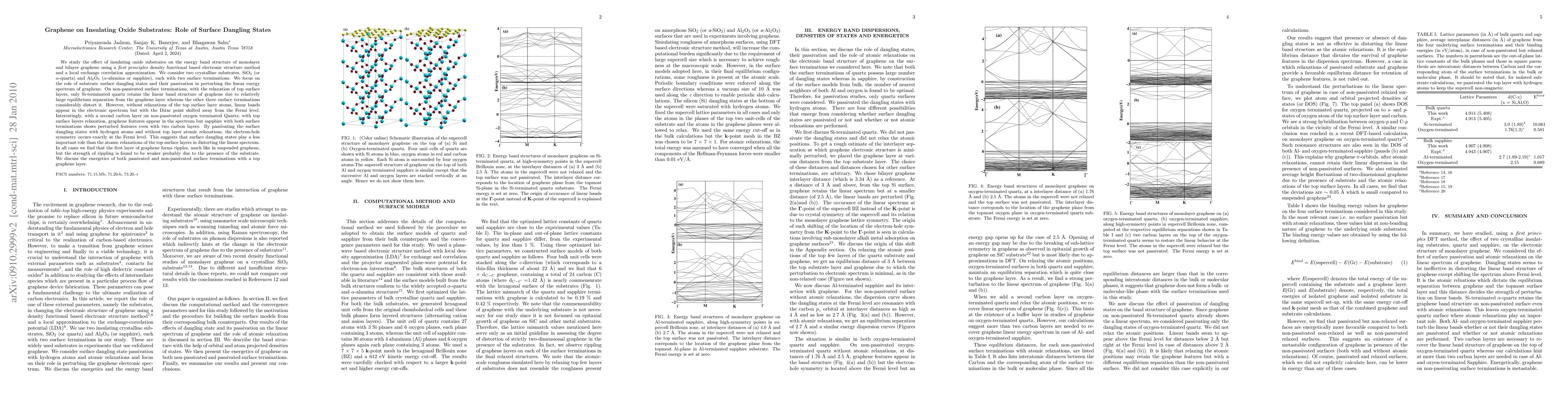 This research investigates the influence of insulating oxide substrates (SiO2 and Al2O3) on the electronic properties of graphene, focusing on the effect of surface dangling states and their passivation. It finds that substrate relaxation and surface termination significantly distort graphene's linear band structure, while passivation with hydrogen restores electron-hole symmetry at the Fermi level, indicating that atomic relaxations have a more substantial impact than dangling states on spectral distortions.