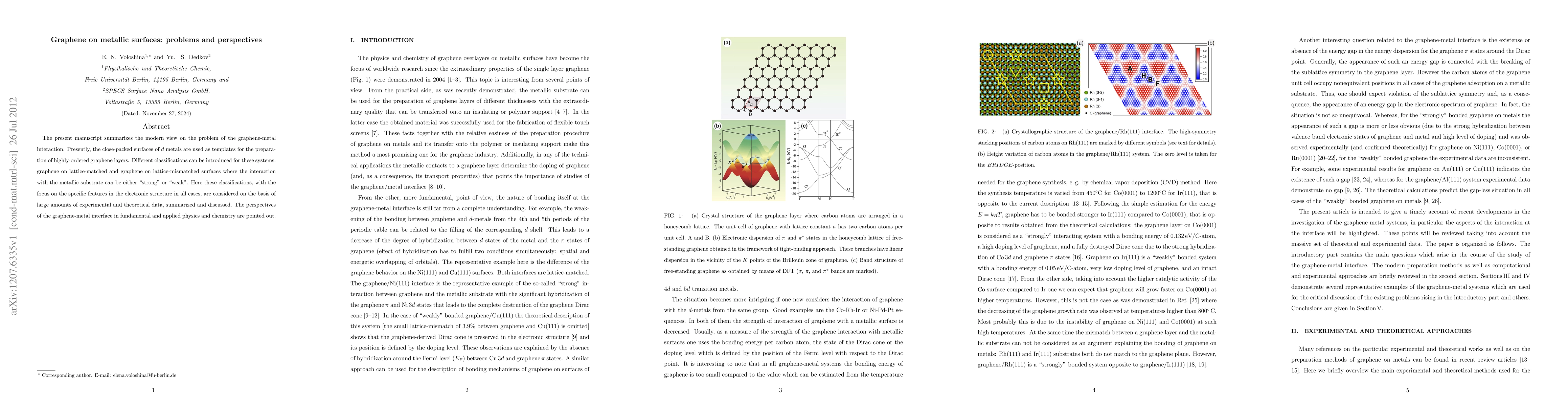 The present manuscript summarizes the modern view on the problem of the graphene-metal interaction. Presently, the close-packed surfaces of d metals are used as templates for the preparation of highly-ordered graphene layers. Different classifications can be introduced for these systems: graphene on lattice-matched and graphene on lattice-mismatched surfaces where the interaction with the metallic substrate can be either "strong" or "weak". Here these classifications, with the focus on the specific features in the electronic structure in all cases, are considered on the basis of large amounts of experimental and theoretical data, summarized and discussed. The perspectives of the graphene-metal interface in fundamental and applied physics and chemistry are pointed out.