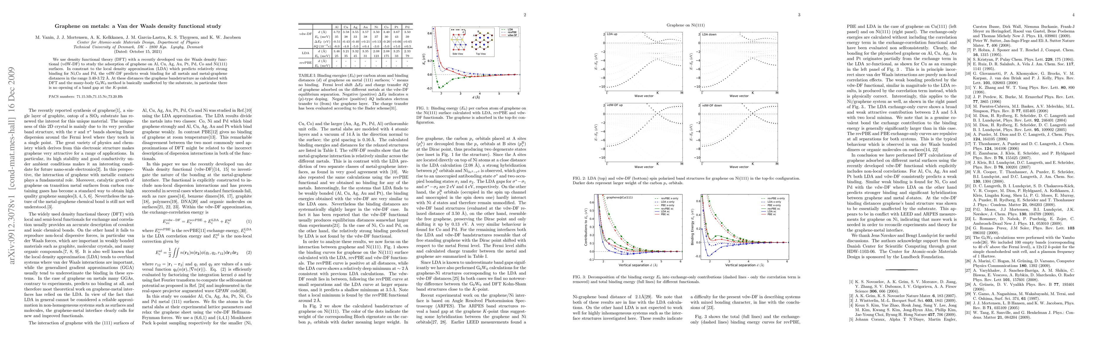 This study employs van der Waals density functional theory (vdW-DF) to examine graphene adsorption on various metal surfaces (Al, Cu, Ag, Au, Pt, Pd, Co, Ni(111)), revealing weak binding compared to predictions from local density approximation (LDA). The calculated metal-graphene distances range from 3.40-3.72 Å, with graphene's band structure largely unaffected.
