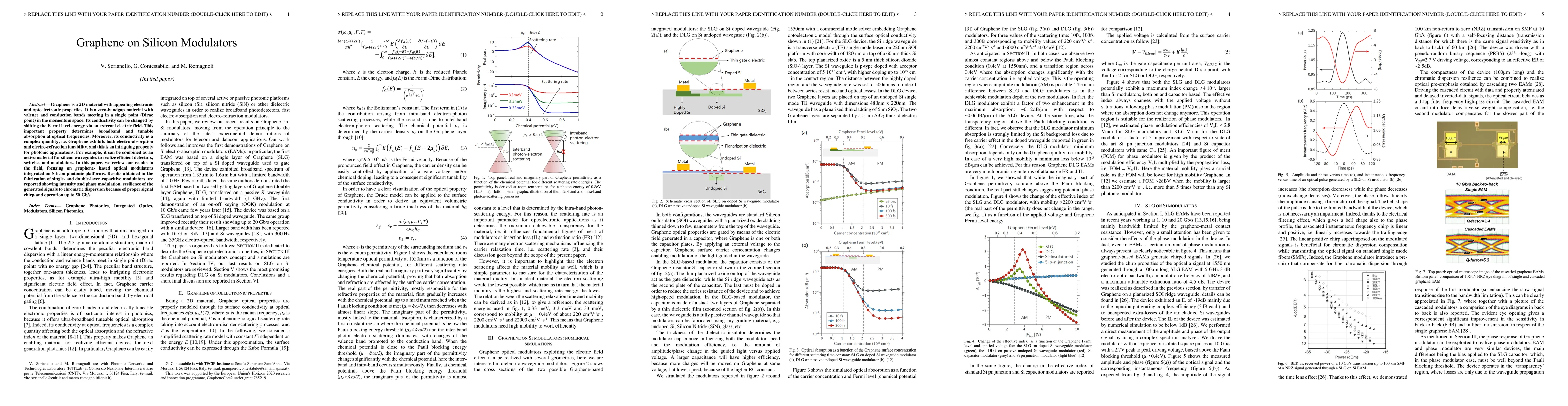This paper reviews the integration of graphene on silicon photonic platforms for optical modulators, demonstrating both intensity and phase modulation capabilities with resilience to chromatic dispersion and operation speeds up to 50 Gb/s. Graphene's tunable conductivity via an external electric field enables efficient detection and switching in silicon waveguides.