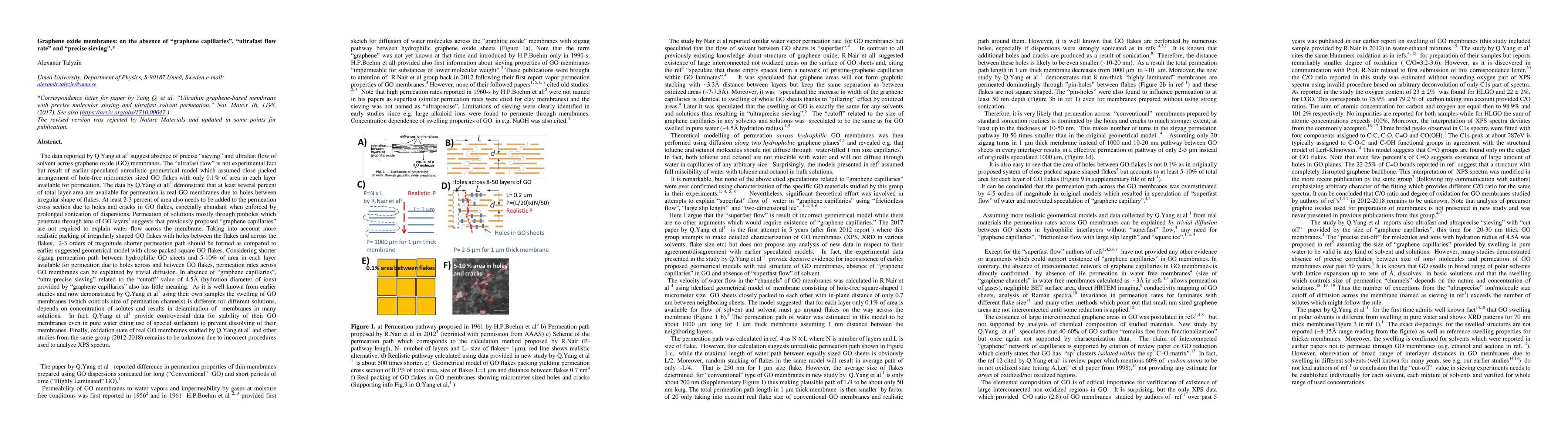 The study by Q.Yang et al. refutes the notion of "ultrafast flow" and "ultraprecise sieving" in graphene oxide membranes, attributing these claims to unrealistic models. Realistic GO membrane structures show permeation through pinholes rather than "graphene capillaries," leading to permeation explained by trivial diffusion.