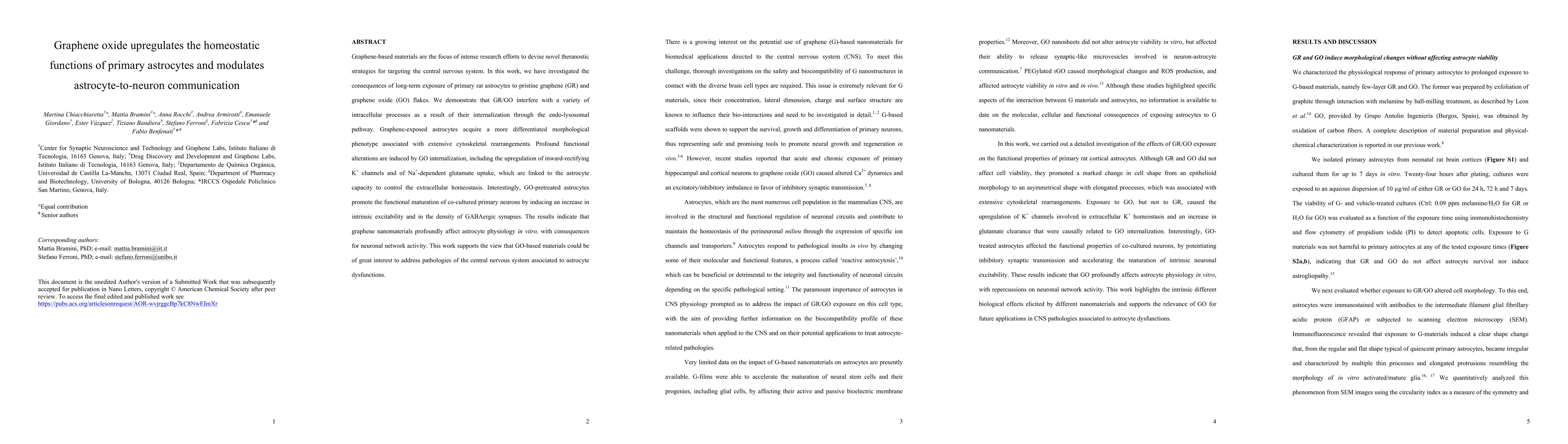 Graphene oxide (GO) enhances the homeostatic functions of primary astrocytes and modulates their communication with neurons, suggesting potential therapeutic applications for central nervous system pathologies.