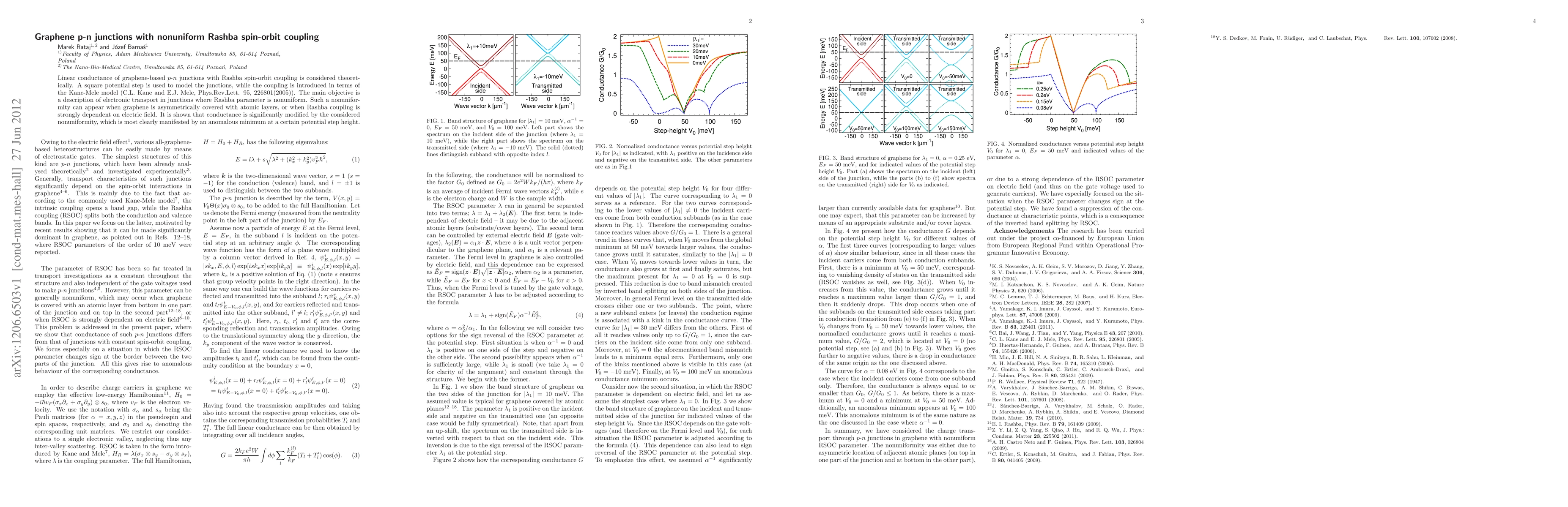 This paper theoretically investigates the linear conductance of graphene p-n junctions with nonuniform Rashba spin-orbit coupling, modeled using a square potential step and the Kane-Mele model. It finds that nonuniformity in the Rashba parameter significantly alters conductance, notably causing an anomalous minimum at specific potential step heights.